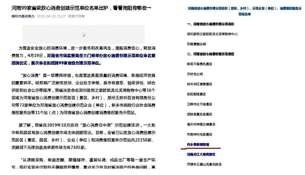 4月19日,河南省市场监管局在三门峡举办放心消费创建示范单位命名暨授牌仪式,首次命名和授牌99家省级创建示范单位,内乡县衙荣获“河南省放心消费创建示范景区”荣誉称号。