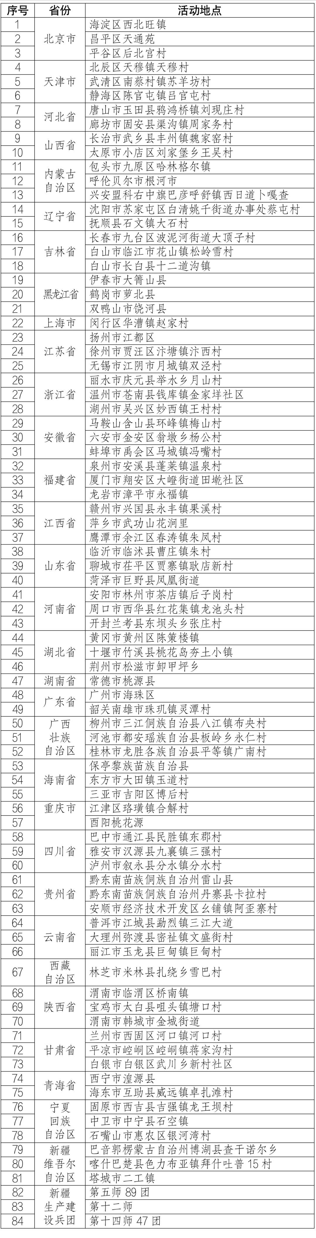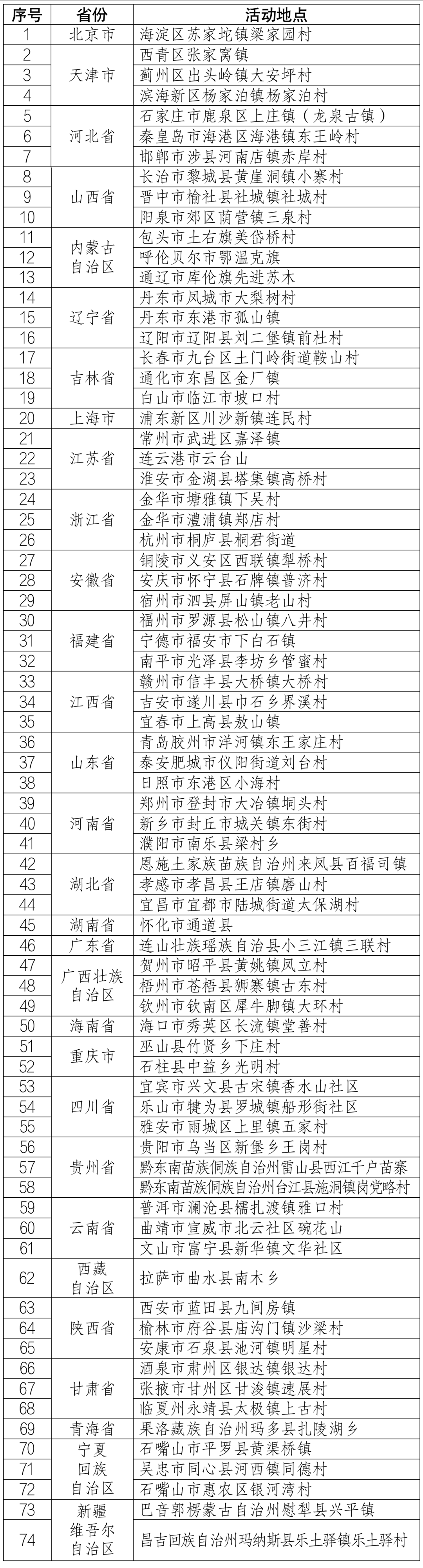 根据《文化和旅游部办公厅关于开展“四季村晚”活动的通知》要求,文化和旅游部公共服务司在各省级文化和旅游行政部门申报推荐的基础上,经研究,确定春季“村晚”主会场设在四川省宜宾市、夏季“村晚”主会场设在云南省丽江市、秋季“村晚”主会场设在江西省九江市、冬季“村晚”主会场设在浙江省丽水市、广西壮族自治区柳州市,并确定了“四季村晚”示范展示点名单,现予以公布。