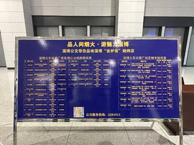 淄博火车站出站口的公交线路指示牌,清晰标明了各线路沿途知名烧烤店。(新华社记者 张超帆 摄)