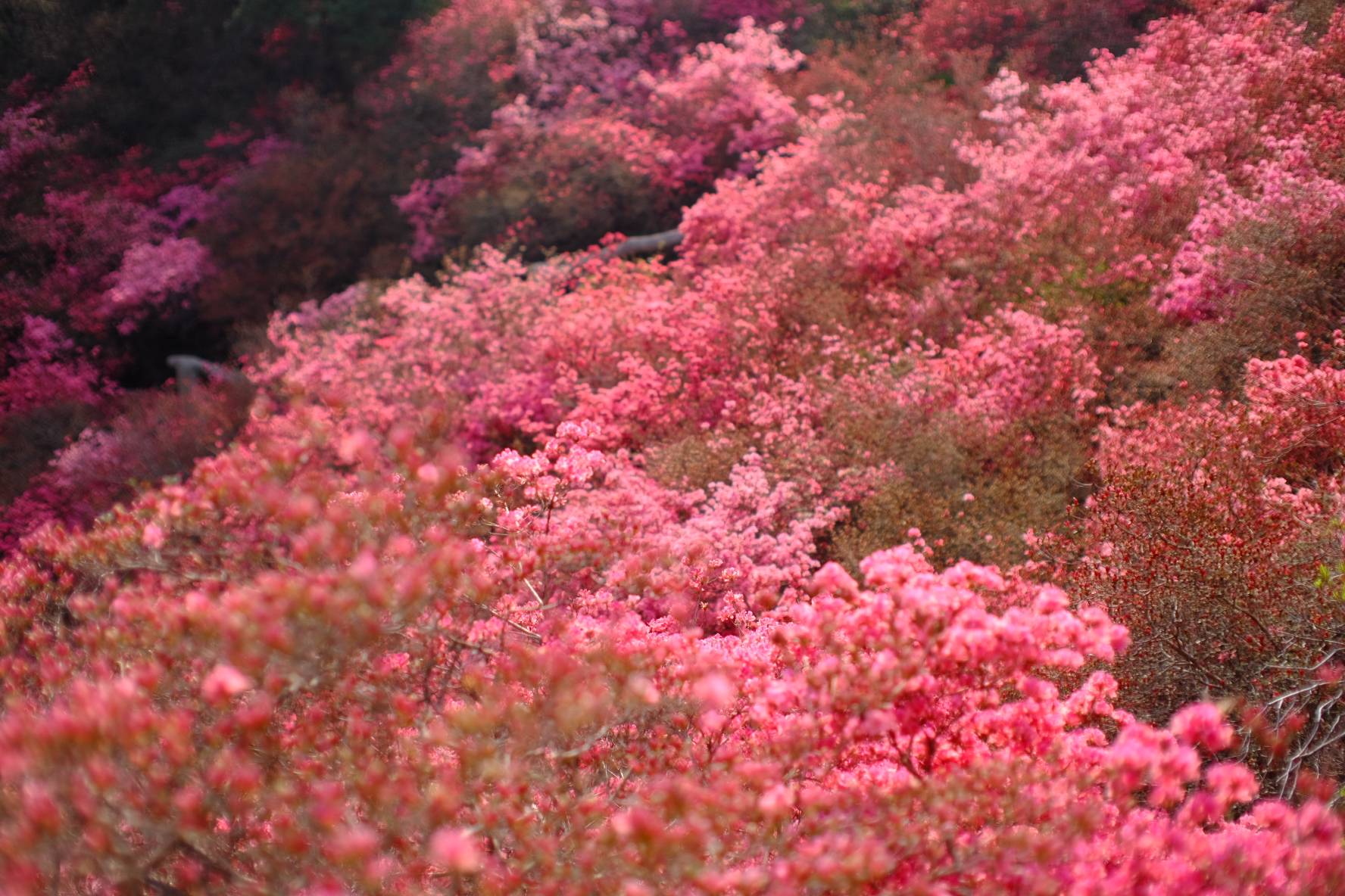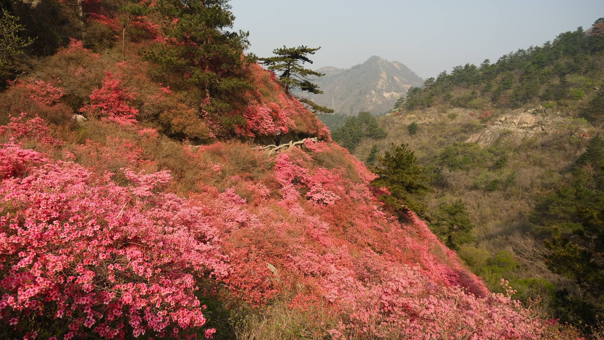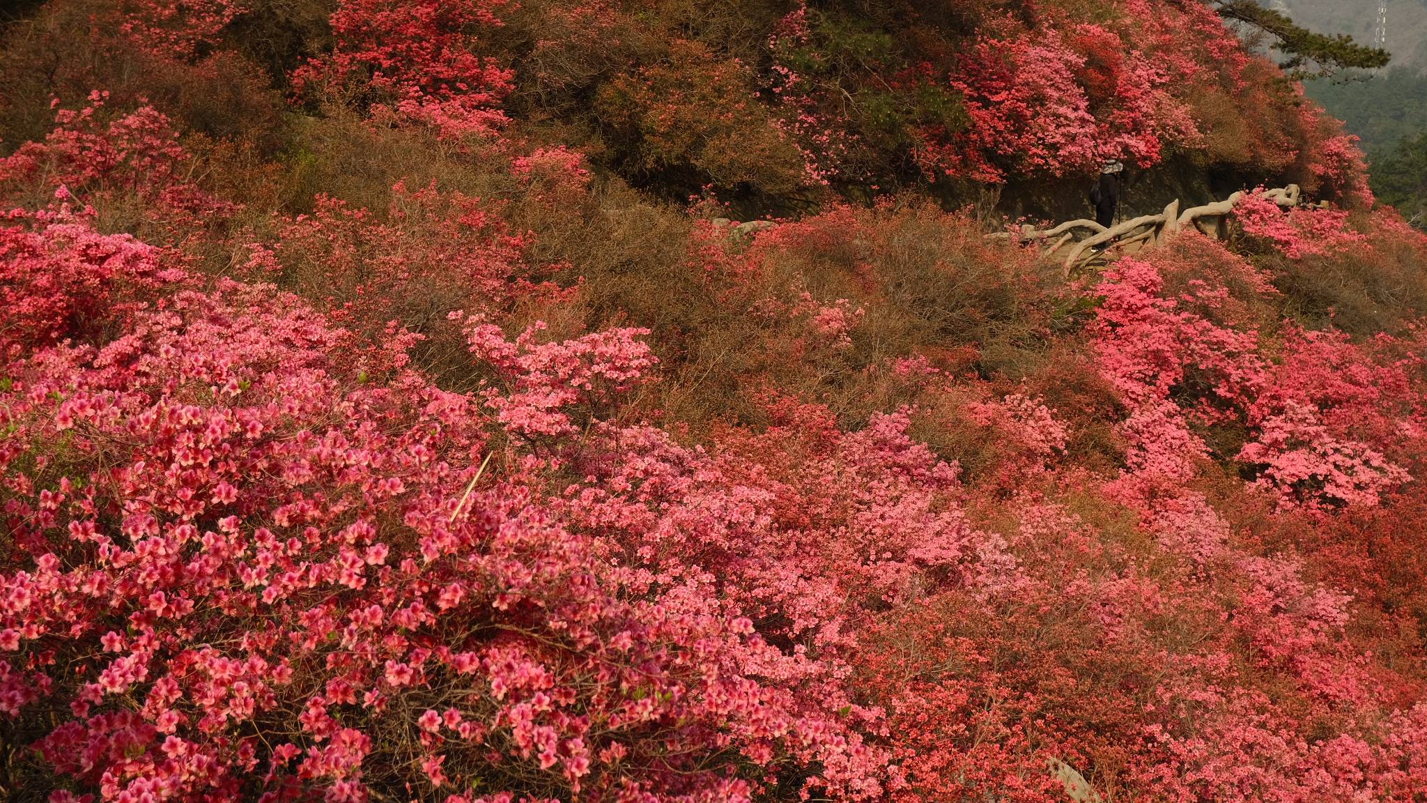 万亩杜鹃花怒放,云雾山披上了锦袍,红色的杜鹃花艳如红云,白色的杜鹃花如白云散落,红白相间的杜鹃,正用画笔给云雾山绘出一幅壮美河山图。初春时节,位于武汉黄陂木兰云雾山的杜鹃花成片绽放,连绵几十公里的山路两侧,不时有大片的杜鹃花花海映入游客眼帘,引来一阵阵赞叹。近几天黄陂木兰天气晴朗,给云雾山杜鹃花盛开带来了有利条件,虽然未到周末,众多外地游客和本地游客还是慕名而来,欣赏云雾山杜鹃花盛宴。杜鹃花同样吸引来众多摄影爱好者和航拍爱好者,一大早花海前,摄影师和航拍爱好者就早早的进入拍摄状态。许多网红和直播带货的新媒体人士,纷纷打卡云雾山,以在线直播把盛开的杜鹃花传播的更远、更广。