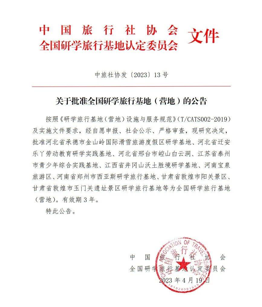 近日,中国旅行社协会、全国研学旅行基地认定委员会通过严格审查,深入调研,最终研究决定了,批准9家研学旅行基地(营地)为全国研学旅行基地(营地),甘肃省敦煌市玉门关遗址景区研学旅行基地获此殊荣。