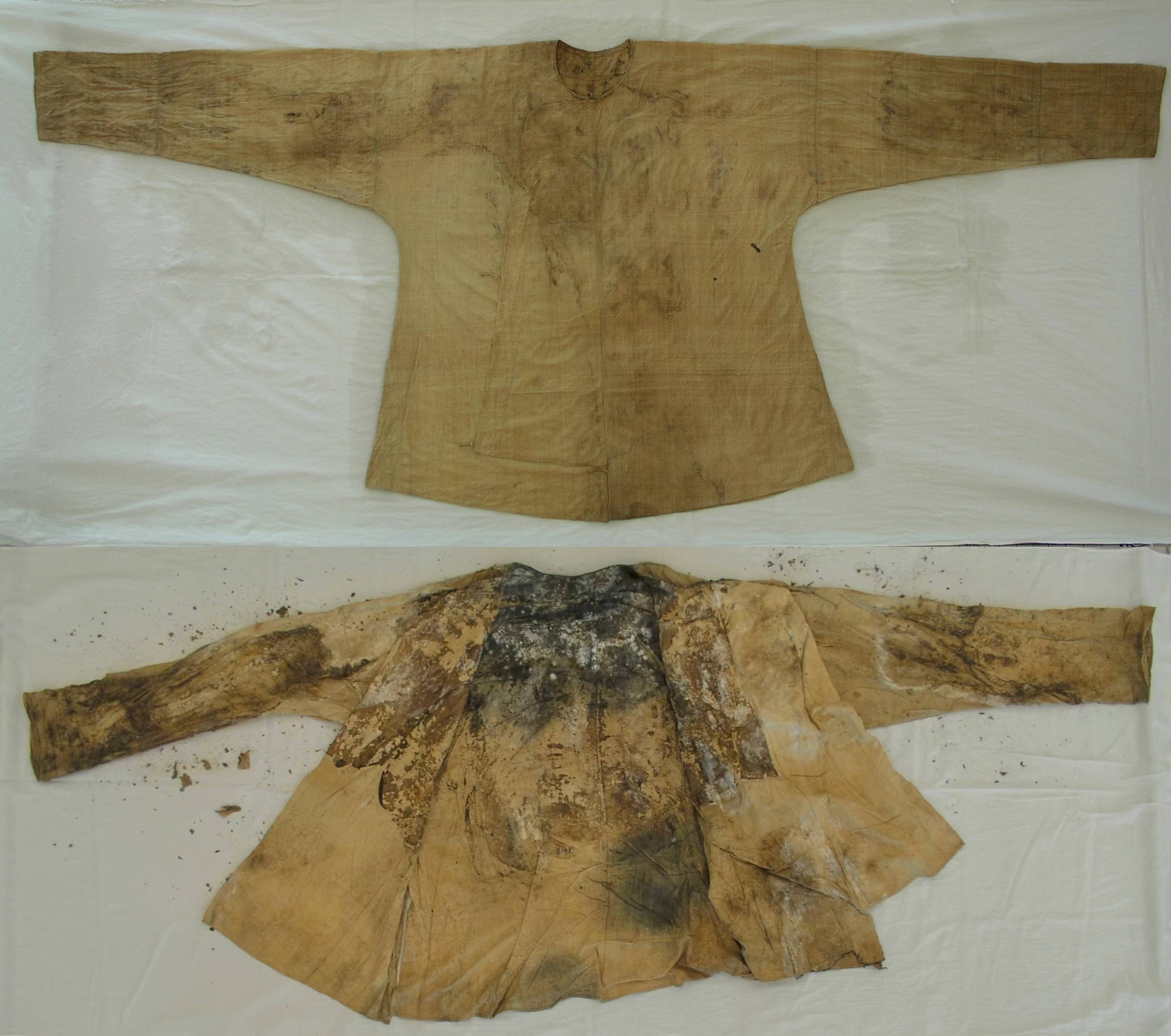 石景山清代武官墓出土纺织品文物的修复前后对比图。受访者供图
