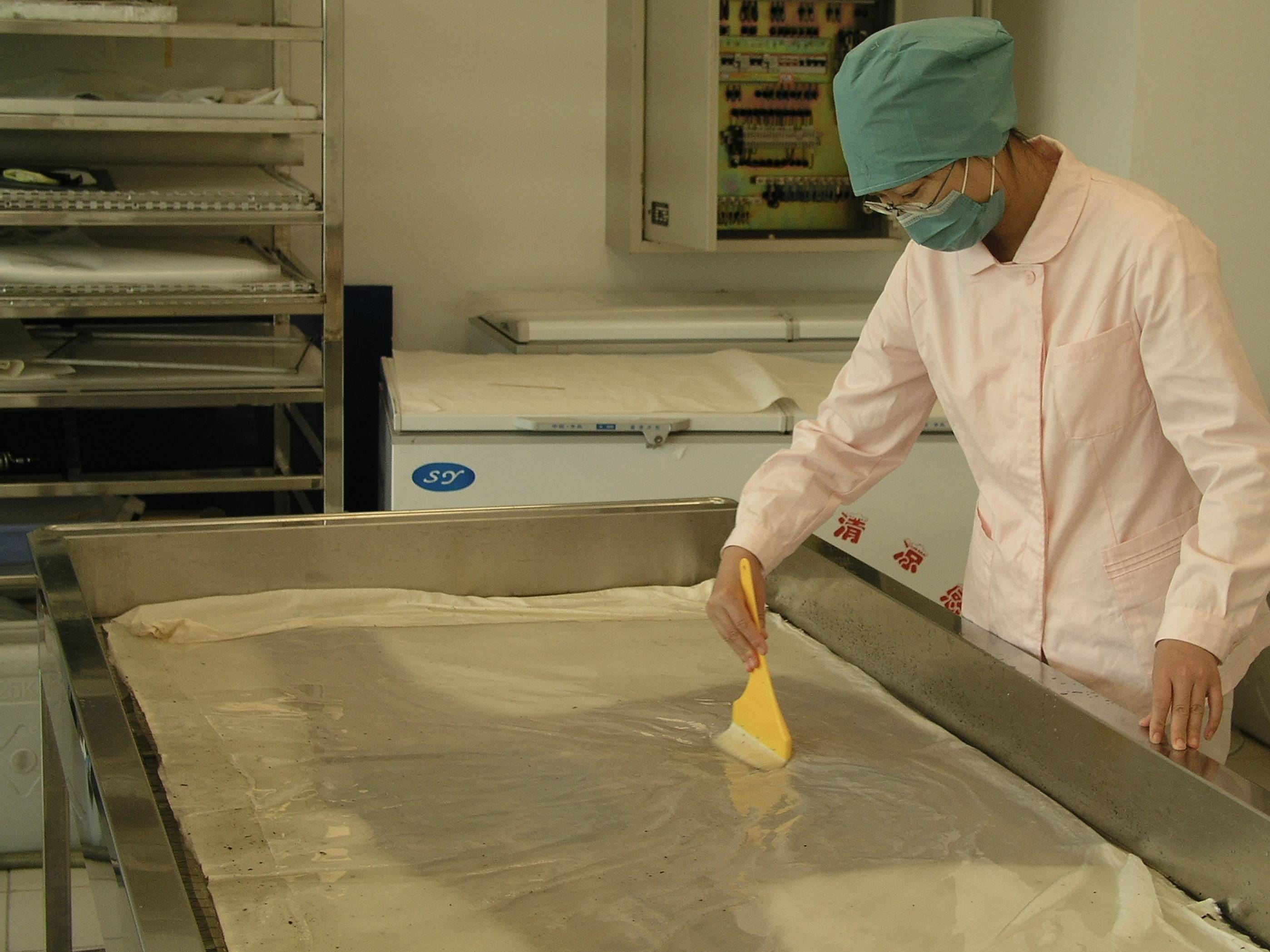 人体的组成部分包括蛋白质、脂肪、糖类等,腐烂之后,无非是这些物质再氧化代谢形成更细碎的小分子。闫丽从菜市场买了猪油炼成液体油模拟尸油,联系学兽医的同学搞来动物血液,将其涂抹在丝织品上放进老化箱老化。这时纺织品已经酥脆了,脂肪、血也充分浸渍,清洗不掉。