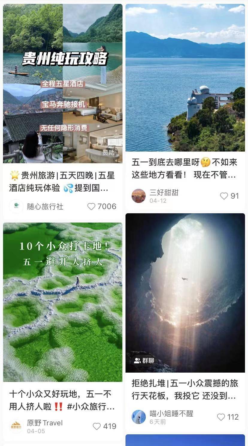 由于“五一”假期热门旅游城市注定“人挤人”,也有不少人开始“躲热点”,不仅要在时间上避开高峰,还要在旅游目的地上也尽量避开人海。笔者在小红书等社交媒体平台以“冷门旅游”为关键词进行搜索,相关分享贴超过3万篇, “五一就去这些冷门城市”“五一小众打卡地”“避开人挤人”等经验分享贴充斥界面,除了小众打卡地以外,更多是以度假为目的的休闲游。