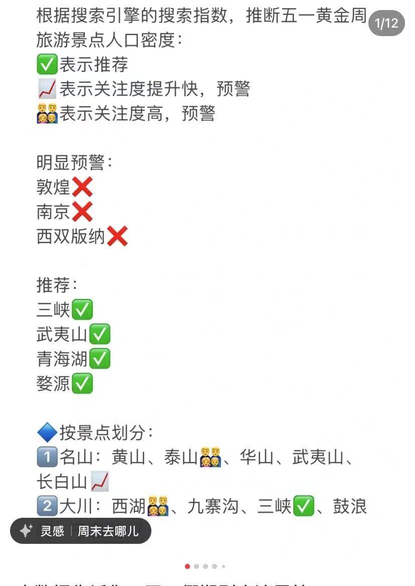 此外,还有一些网友根据搜索引擎以及社交平台点赞数进行统计,总结出了一些热度稍低的旅游景点,如青海湖、三峡、武夷山等地。同时统计出了关注度提升快以及关注度较高的景点,如贵阳、珠海、福州、西双版纳等地。作为职场人五一“躲热点”的选择。