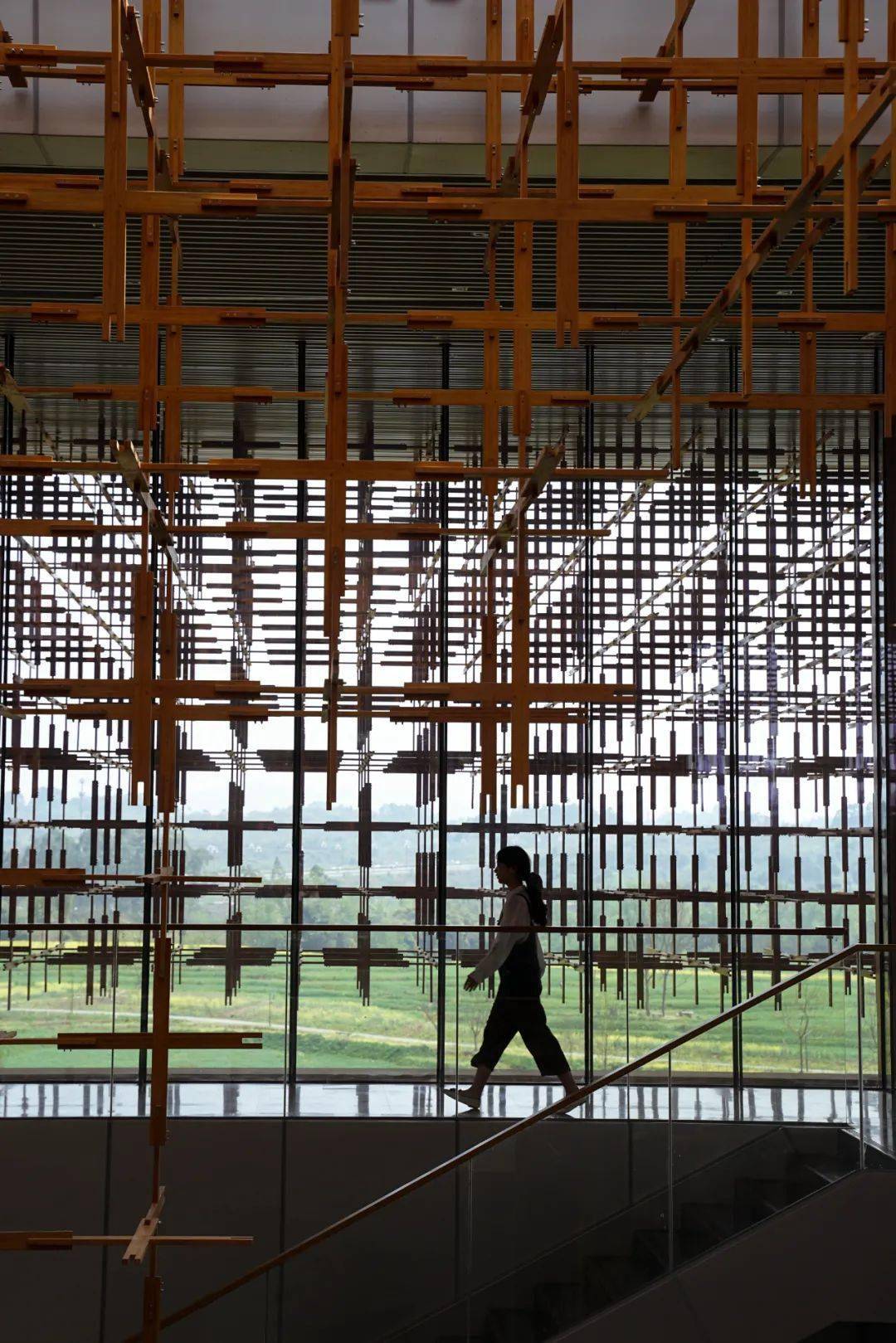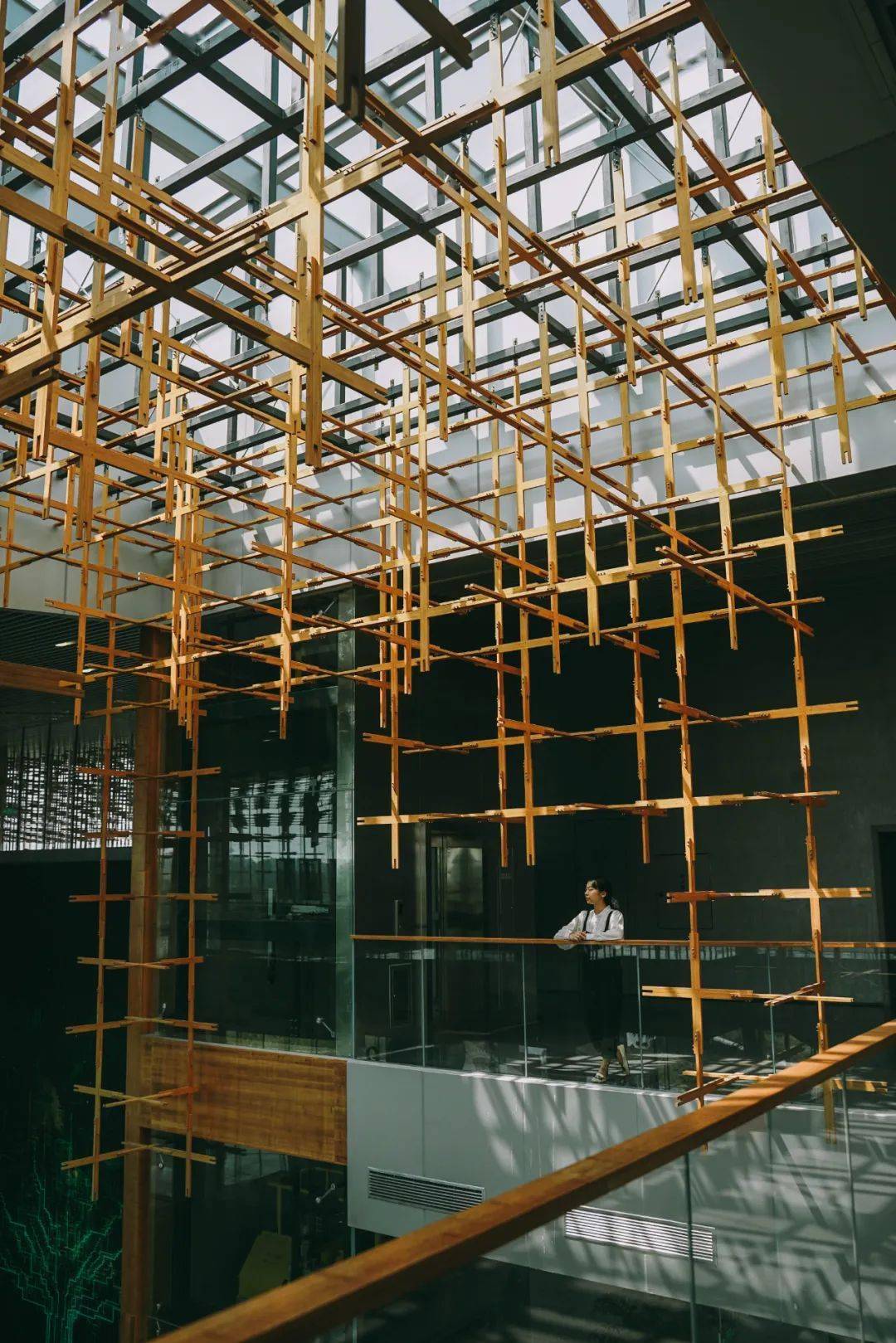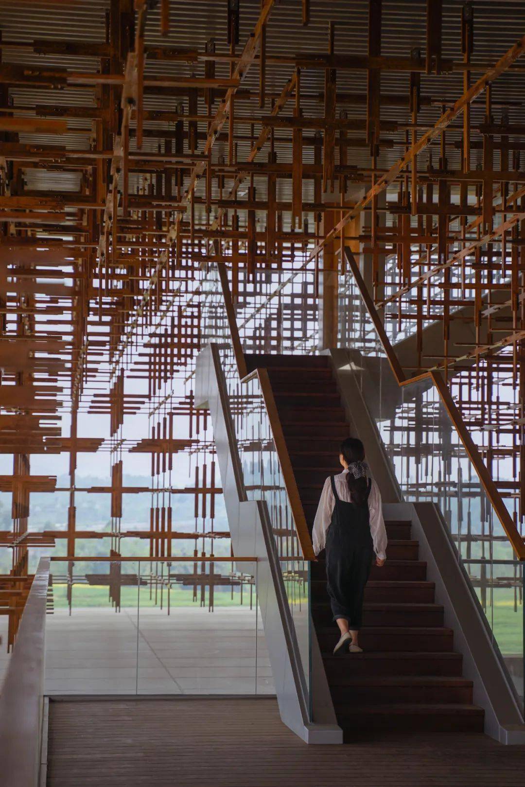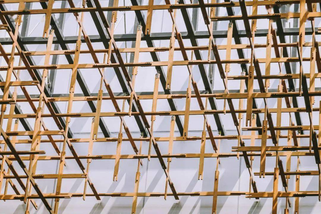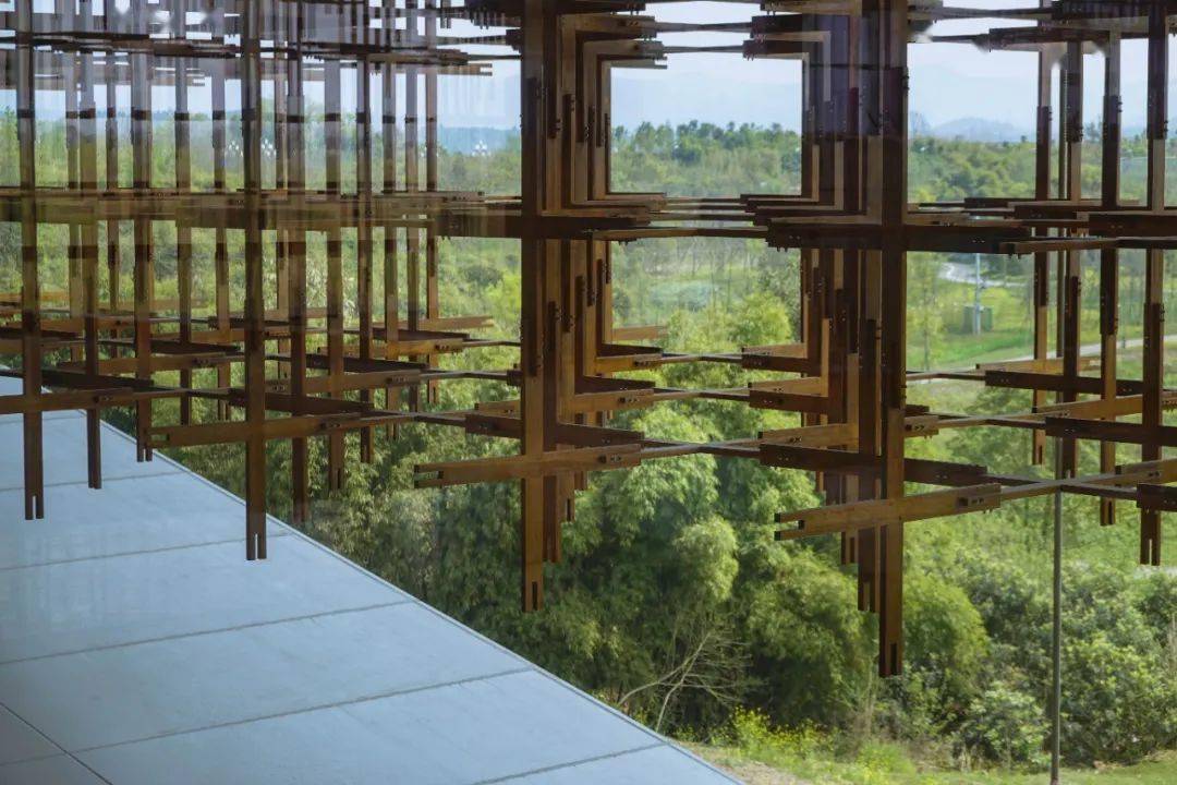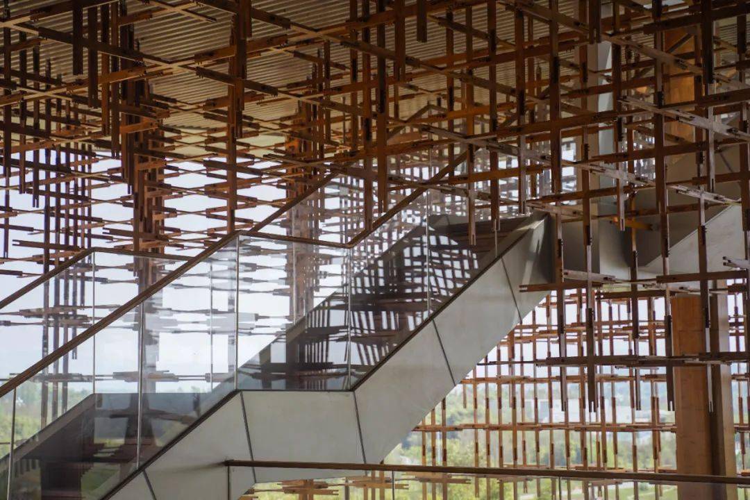 走近雁之羽,所有的注意力一定会被这个形似榫卯结构却叫不出名字的巨型“装置”吸引住。它环建筑一圈,将建筑二层围起来若有似无。