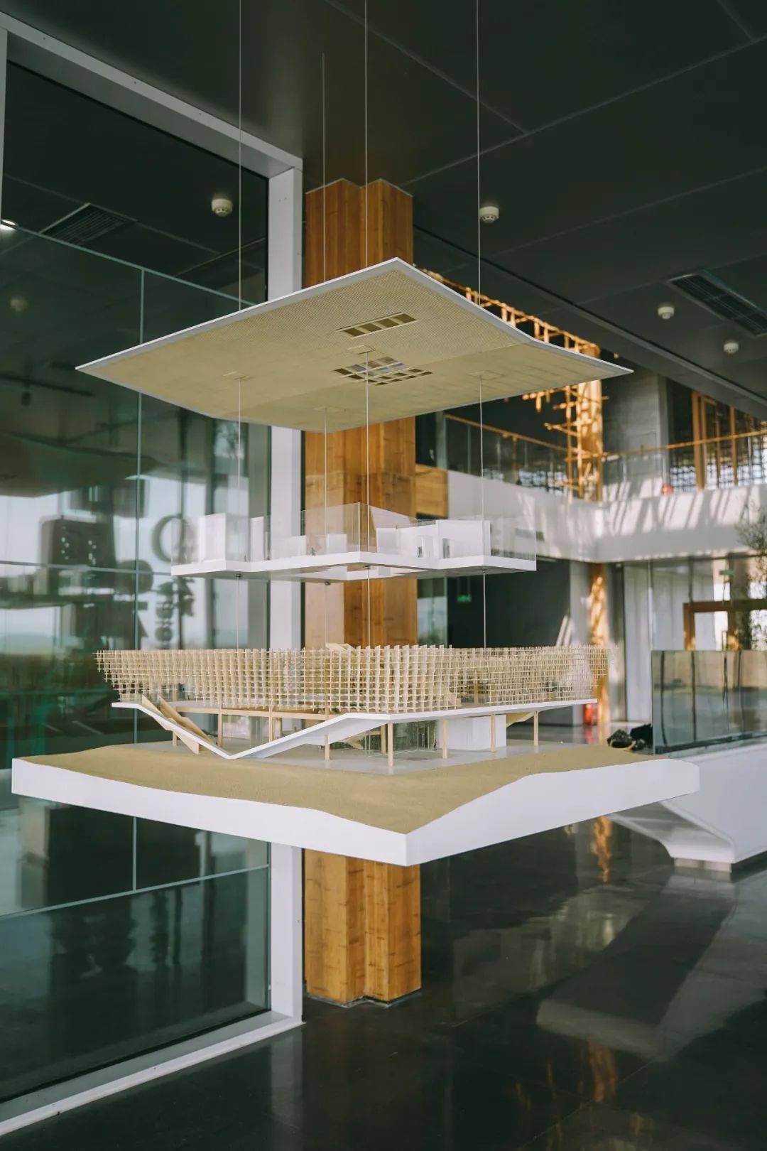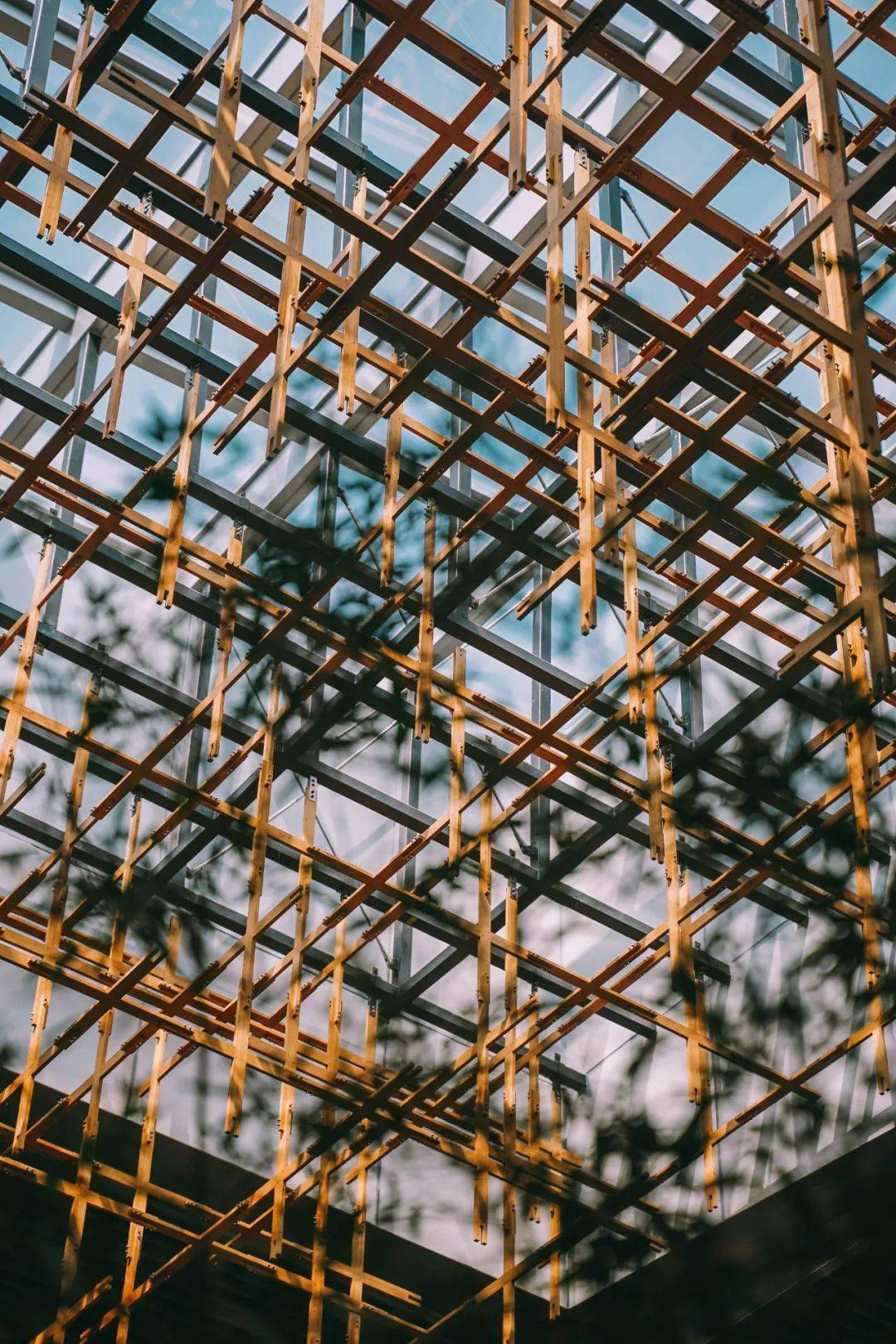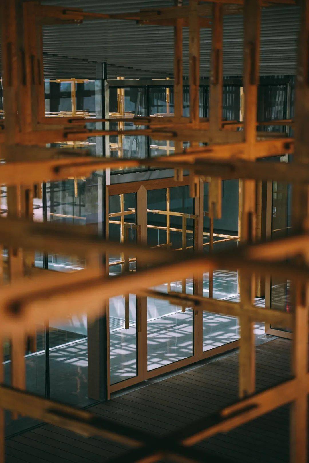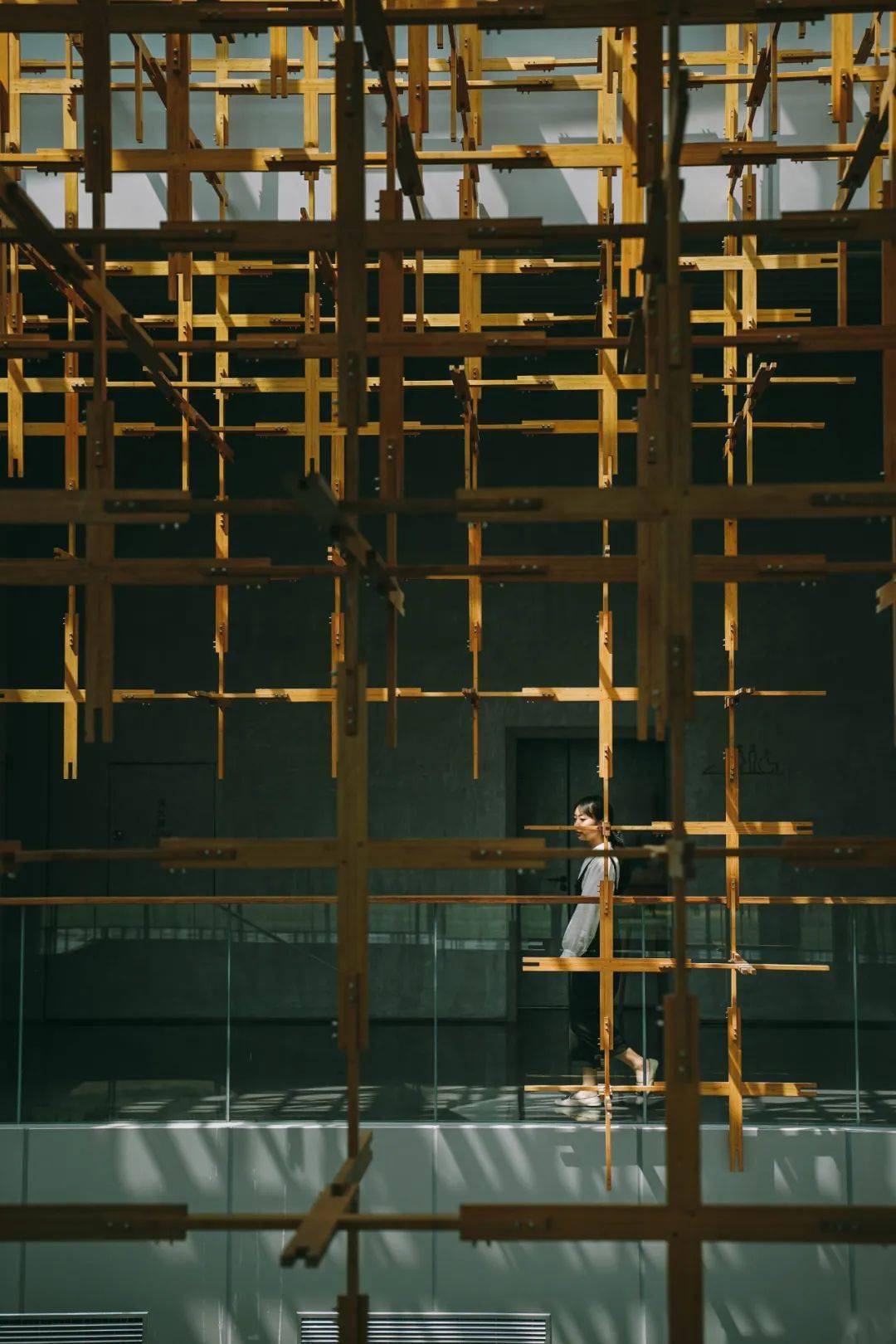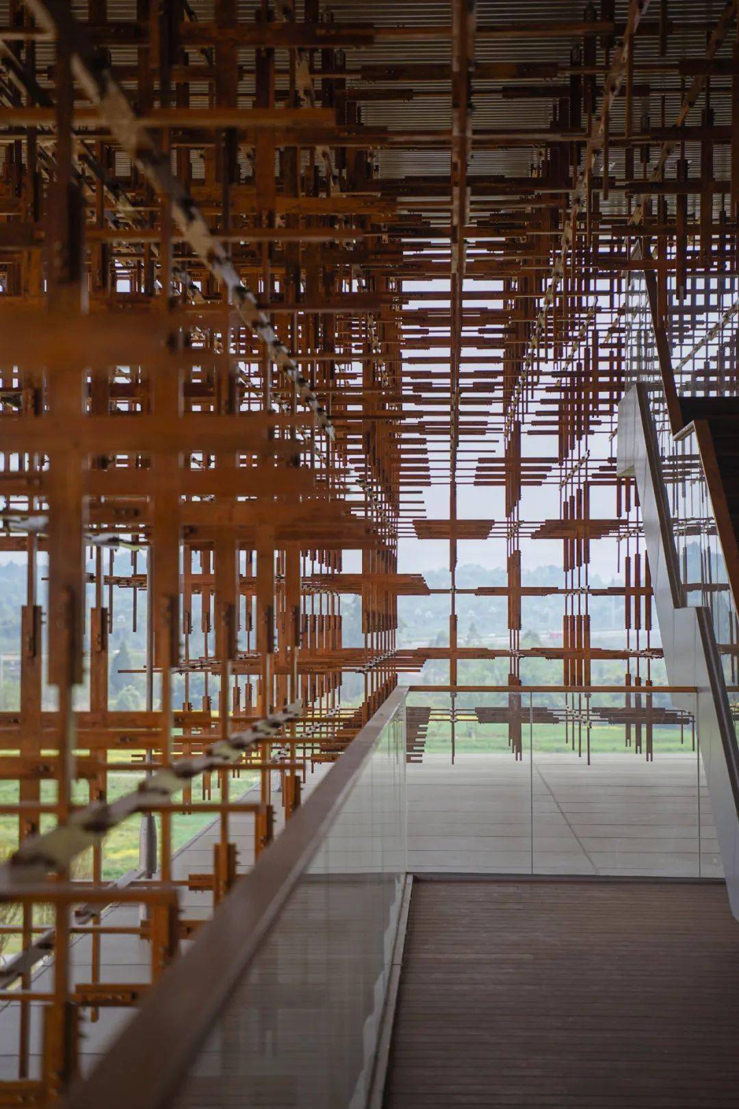 走近雁之羽,所有的注意力一定会被这个形似榫卯结构却叫不出名字的巨型“装置”吸引住。它环建筑一圈,将建筑二层围起来若有似无。