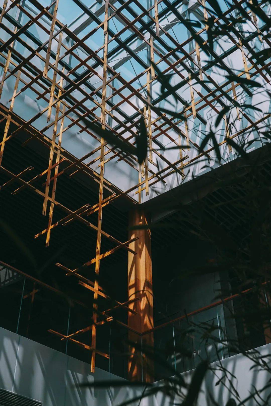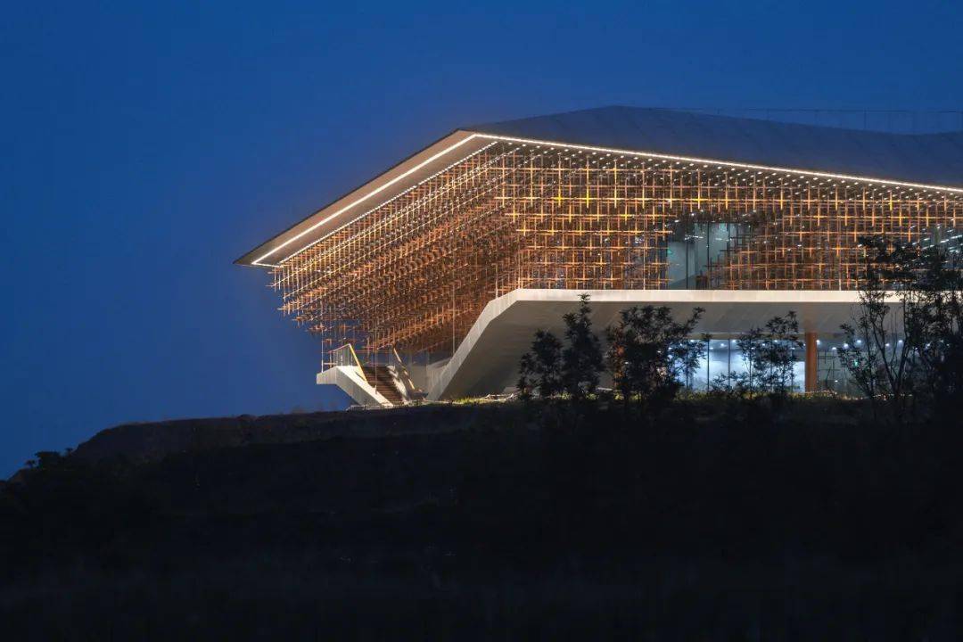 这种融合了传统材料和新型工艺而形成的竹钢材质,层层叠叠地排布在屋檐下的玻璃幕墙四周,形成独特的立面造型,远看似雁羽般轻盈有力,近看又不失羽翼的细节。