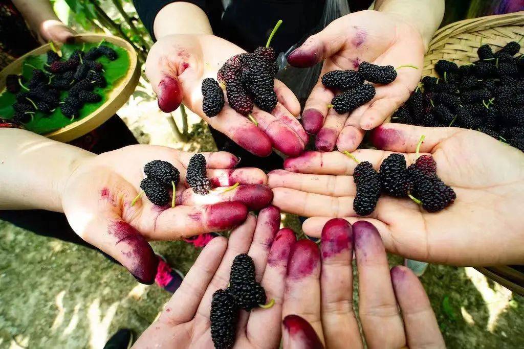 采一把桑葚,感受摘下时的清脆声响;揉进嘴里,品味果实爆发的美味口感。