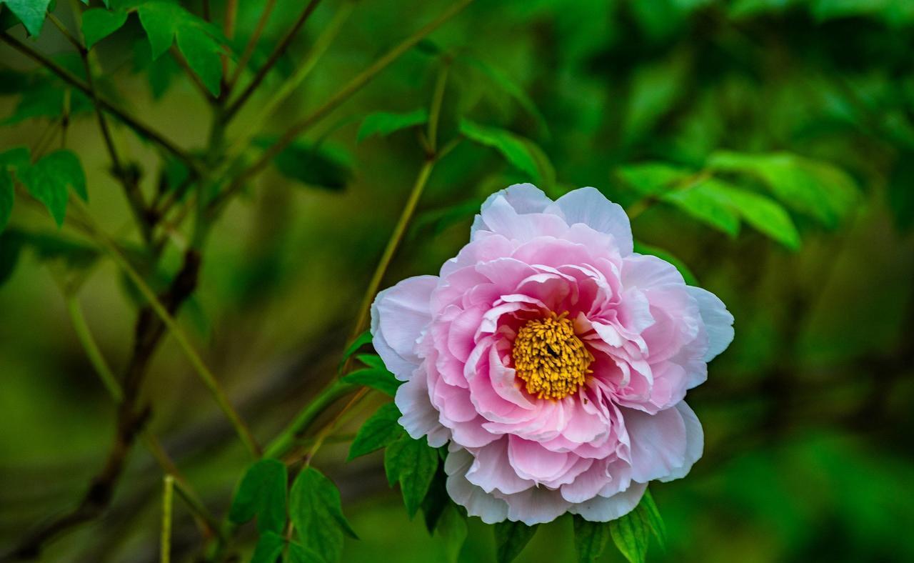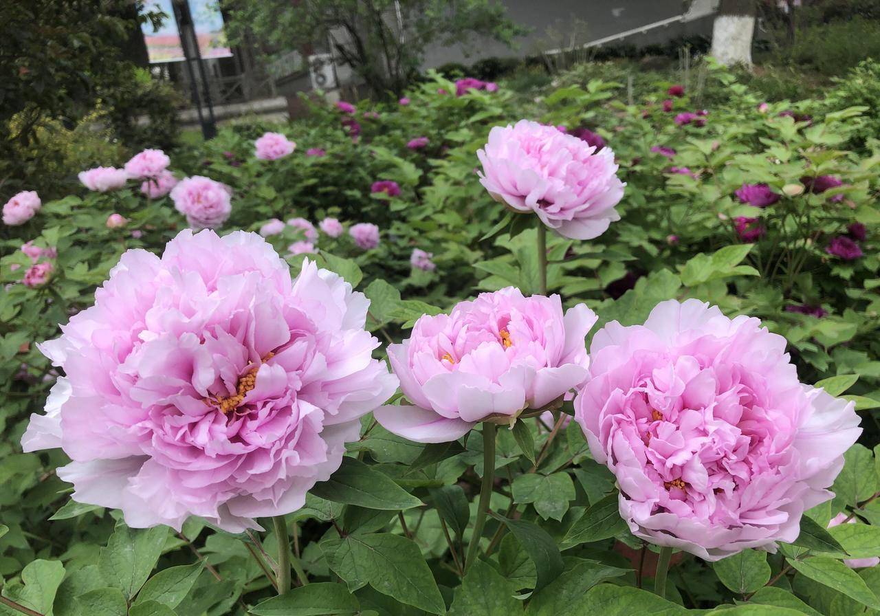 ‘西施’牡丹花瓣纤薄盈润,粉红的颜色更显得花朵娇柔无比。牡丹名品‘岛锦’一花双色,花朵红白相间,或是红色花瓣中间长着白丝,或是如玉白色打底,粉红色丝线点缀在花瓣中间,为少见的复色牡丹。‘玫红’花如其名,一抹抹梅红色惹人注目。种植池内群植的几十株‘玫红’全部开放,一眼望去颇为惊艳。‘玫红’的花朵与叶片高度差不多,花在叶中若隐若现,姿态华贵中又添了一份含蓄婉约。牡丹品种繁多,色泽亦多,尤其以黄、绿为贵。绿色牡丹珍品‘绿幕隐玉’‘豆绿’已经绽放绿意,即将迎来盛放。‘豆绿’是纯正的绿色牡丹,花为绣球型,因色如青豆而得名。‘豆绿’花苞也已经显色,隐隐绿意让人期待。清明节过后,从法国、日本、美国引进的‘金阁’、‘黄冠’、‘海黄’,中国牡丹四大名品之一的‘姚黄’等9种名贵黄牡丹将压轴登场,再现牡丹的绝代风姿。沿着牡丹园曲径通幽的小路闲庭信步,牡丹如璀璨群星熠熠生辉,明媚了春光惊艳了游人。红的耀眼的‘首案红’‘红艳争辉’‘霓虹焕彩’,泛着优雅白的‘白雪塔’,紫红色的‘今紫’,如少女羞红了脸的粉色牡丹‘雪映桃花’‘火鸟’,不负诗曰“竟夸天下无双艳,独占人间第一香”。牡丹展的花期将持续至4月中下旬。武汉植物园牡丹园还种植了1000株芍药,芍药有“花相”之雅誉,花期比牡丹晚半个月左右。进入四月,“花王”“花相”争辉斗艳,也是一大看点。