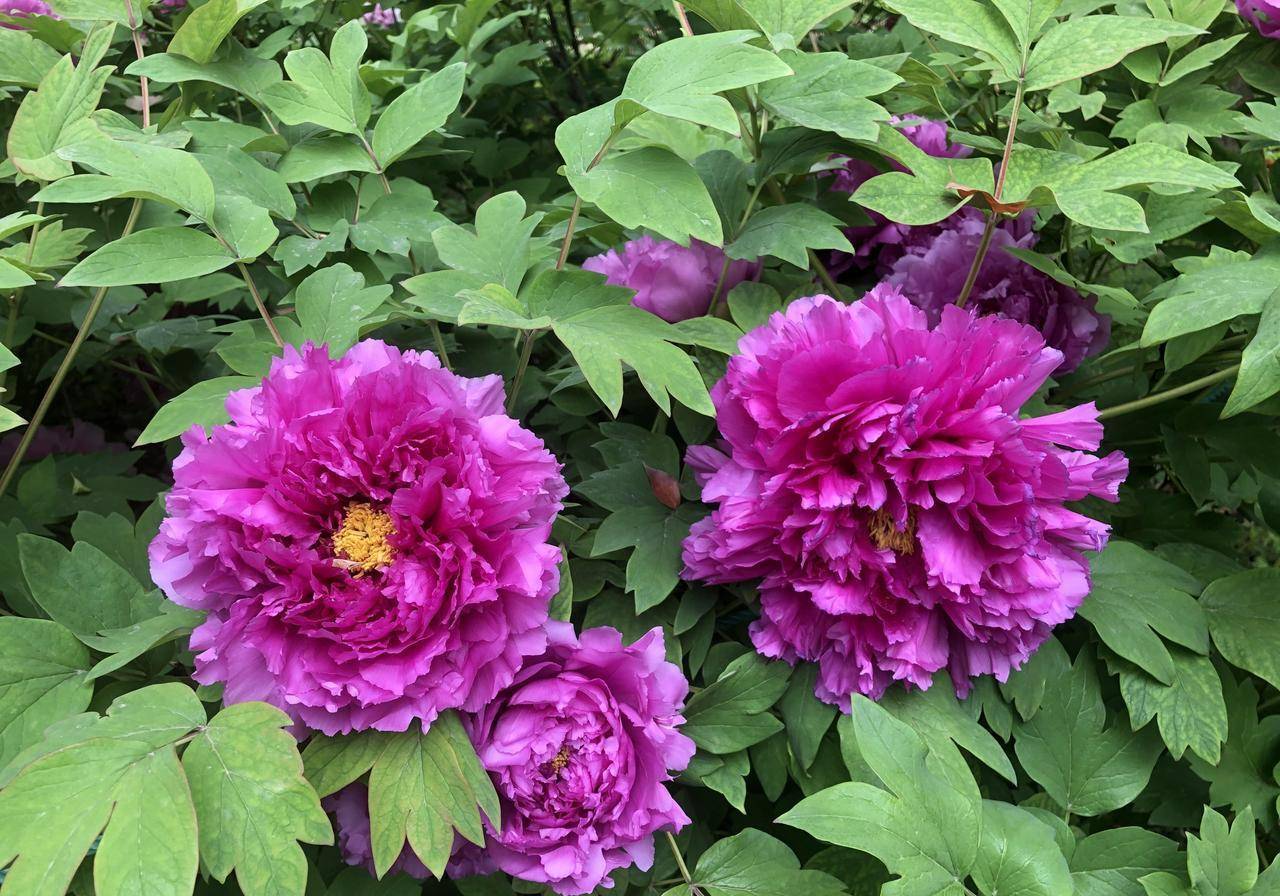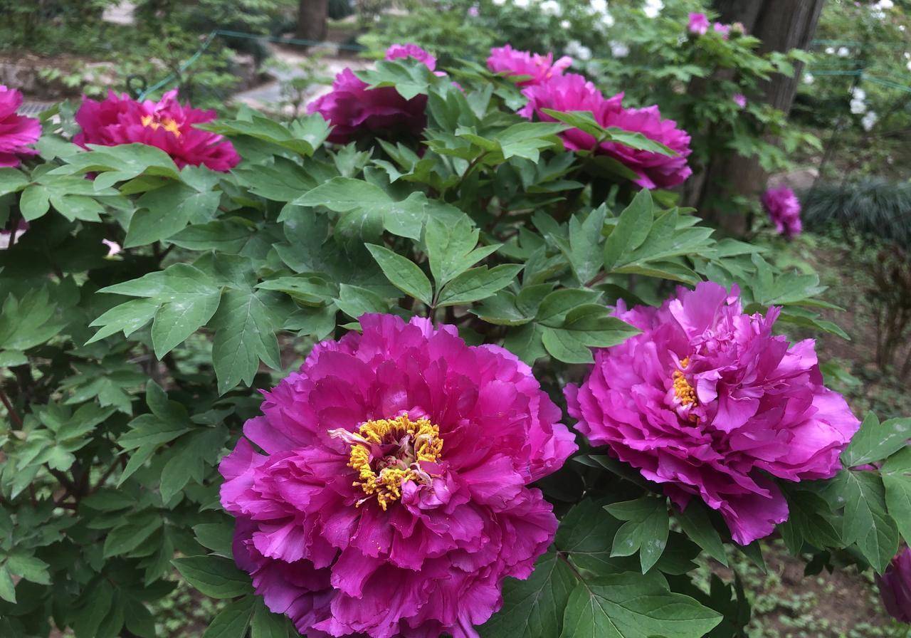 走进武汉植物园牡丹园,阵阵清香扑入鼻息。目前牡丹已经开放近半。嫣红、玫红、浅粉、黛紫、乌墨、明黄、玉白、豆绿、粉蓝、复色,各色牡丹将姹紫嫣红开遍,似风姿绰约、端庄明丽的美人,盈盈一笑便走进了你的心里。湖北保康野生牡丹和凤丹牡丹先声夺人,它们以白色、粉白色居多,如霞似雪,馨香袭人。保康牡丹花朵多顶生,花朵凌于叶片之上,朵朵白雪汇成花海,其飘逸的姿态轻逸出尘,一展牡丹的婉约风姿。江南牡丹、中原牡丹火速加入赏花大幕,成为主力大军。墨色牡丹‘墨楼争辉’‘珠光墨润’已经霸气全开,紫黑色的花瓣带着绸缎质地的光泽。‘芳纪’为高饱和度的正红色,在红色系牡丹中色彩最为浓郁和纯正,被称作“最红的红牡丹”。‘富贵满堂’,花瓣重重叠叠,繁复精巧,顾盼生姿,硕大的花朵和富态的身姿完美地诠释了牡丹的雍容华贵。‘雪映桃花’,浅粉色娇艳如桃花,还带着清新悠远的香味。