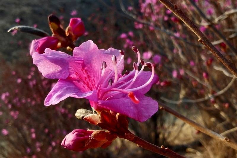 阿荣旗境内延伸着大兴安岭余脉,所以这里的杜鹃名叫“兴安杜鹃”,当地群众也叫它映山红、达子香。阿荣旗地域辽阔,1.36万平方公里的土地上,杜鹃花由南至北次第绽放,从4月中旬一直到5月中旬,拉长了杜鹃花的花期,也吸引了众多游人前来观光赏花。(于雪梅)