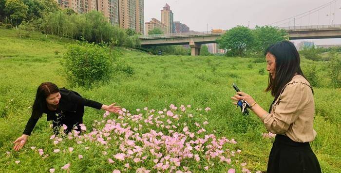 今天上午,笔者在雅士林大桥下的风光带中,远远望去,看到河滩上盛开着一片片粉红色的小花朵,星星点点的小花瓣在阳光下,呈现出一种透明的质感,就像一只只小粉蝶,轻轻飞舞,引人注目。