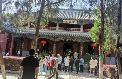 武侯祠最后一排的建筑是宁远楼,取诸葛亮名言“淡泊以明志,宁静以致远”之意。宁远楼门柱上有一幅名联,内容是:“能攻心则反侧自消,从古知兵非好战,不审势即宽严皆误,后来治蜀要深思”,讲解员正在一群游客讲解这副对联的深意。