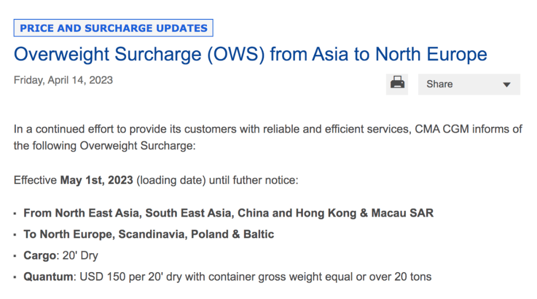 据最新消息,达飞发布两项收费公告,涉及亚洲至北欧航线附加费调整。