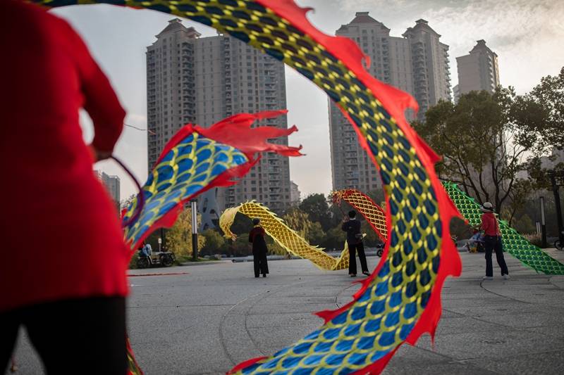 04、2021年12月11日,长宁区苏州河边的一号绿地上,居民们在此舞起健身龙,既锻炼身体又可以交流。