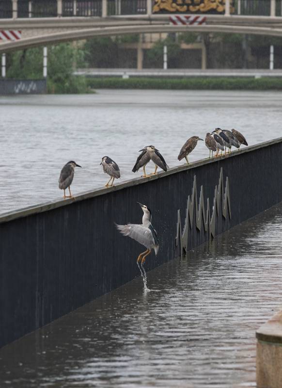 07、2021年7月26日,台风“烟花”导致苏州河河水上涨,漫上亲水平台。无人来此让这里成了鹭鸟的世界,休息、捕食,不亦乐乎。