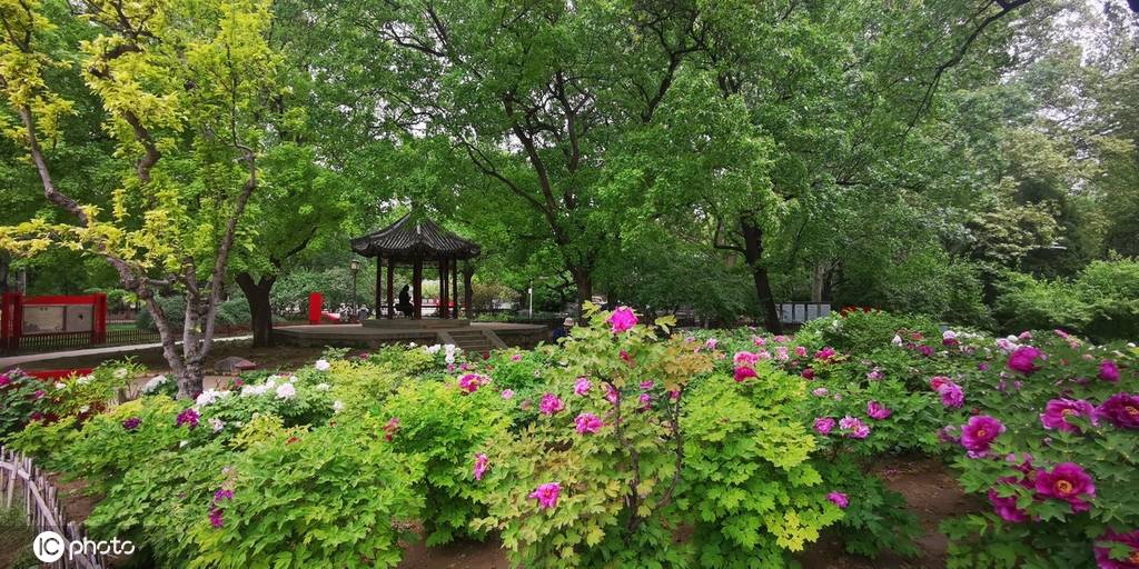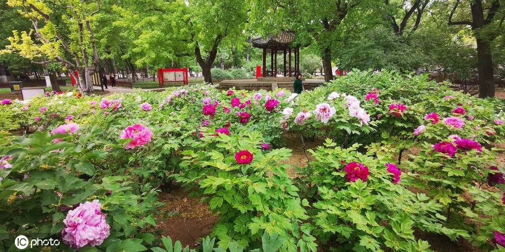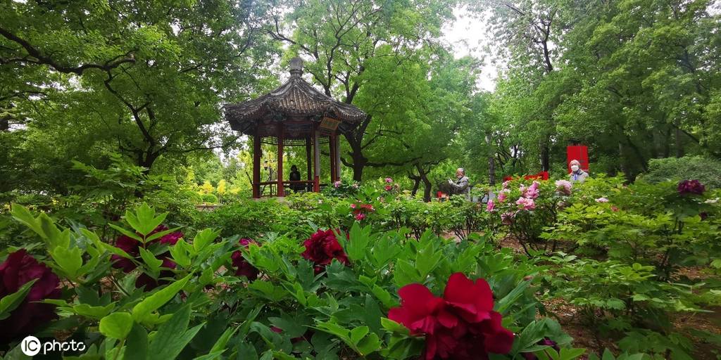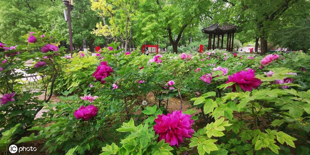 北京地坛公园牡丹盛开,市民赏花乐陶陶。