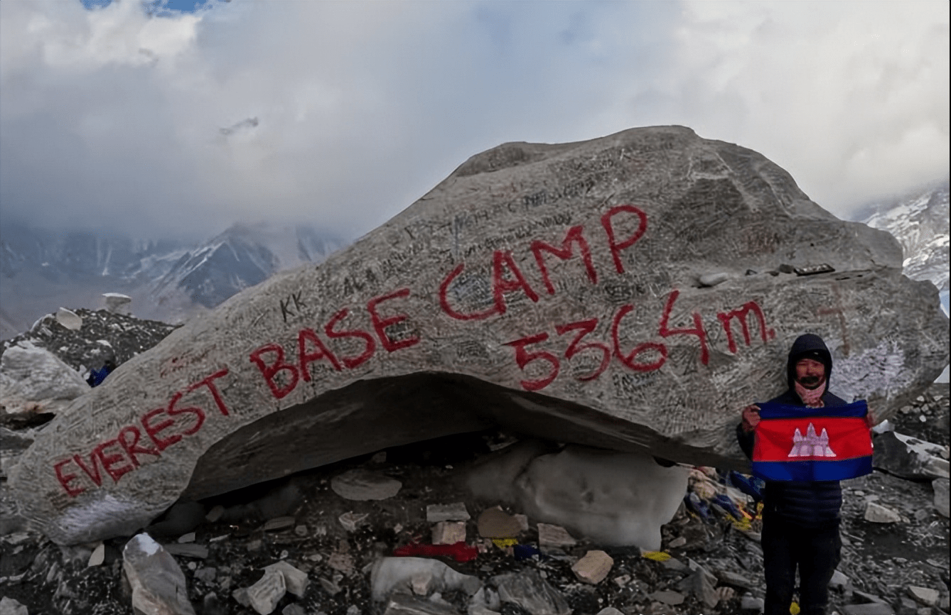 据柬媒消息,4月20日,一名柬埔寨男子脸书上发帖表示,自己成功带着柬埔寨国旗登上珠穆朗玛峰大本营,海拔5364米。
