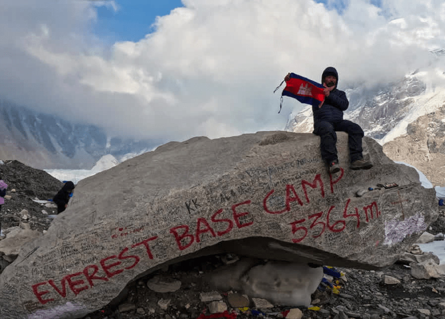 他写道:“我非常自豪,我在珠穆朗玛峰大本营举起了柬埔寨国旗,我徒步从尼泊尔的卢卡拉来到了珠穆朗玛峰大本营,来回11天,路程120公里,我实现了其中一个梦想。”