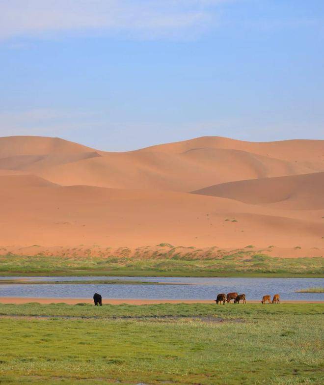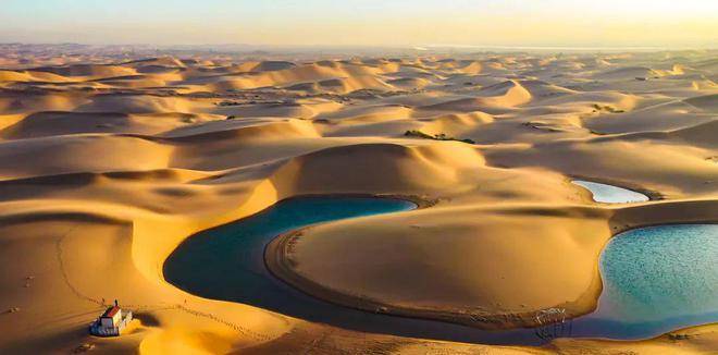 腾格里沙漠里有422个青绿色草湖,多呈长条形,藏在沙丘的下面。翻过沙丘,你看到的或许是一片绿洲,水鸟嬉戏。一些蒙古族牧民的家,也建立在这些沙漠湖泊旁边。