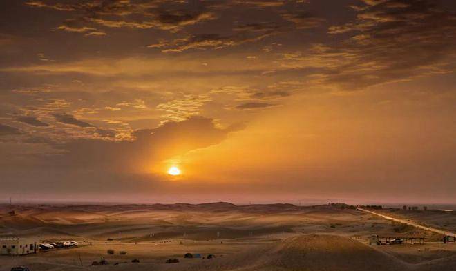,目光所至一片狂野荒凉,冉冉升起的太阳,一点点照亮这片沙漠,一种安静的氛围从四面八方涌入,远处骆驼低头吃草身体随着咀嚼起伏,一切都充满着希望。