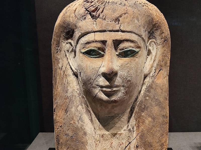 一件木乃伊半身棺盖(木质彩绘)是晚王国时期的遗存,这是一个木乃伊头部的棺盖,逝者头戴三面假发,棺盖绘有圣甲虫神凯普里图案。面部特征十分清晰,眼线和眉毛为青铜色,瞳孔是用黑色的石头做的,白色的眼睛是用骨头做的,戴着一个漂亮的胸甲,上面有鹰隼头的装饰。花朵在葬礼仪式中拥有至关重要的作用,在逝者的坟墓中,还发现了由彩陶珠子、树叶和花朵组合制成的项链。棺盖上描绘的宽项链(即韦斯克赫特项链)装饰的花朵象征着为逝者提供更鲜活持久的再生能力。