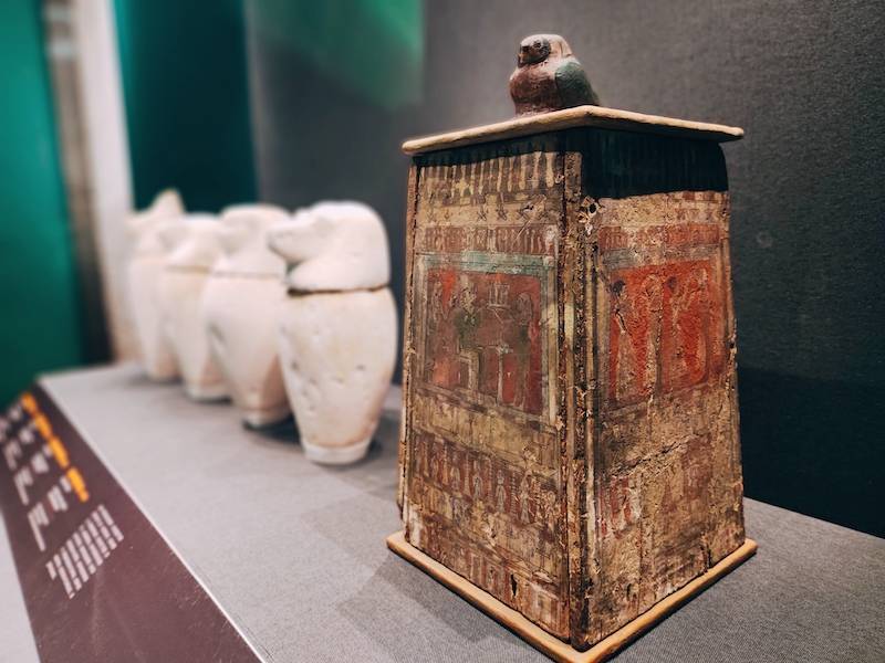 古埃及时期,万物皆可木乃伊,现场也展陈了用于存放制作木乃伊时保存内脏的卡诺匹斯罐和各种动物的木乃伊。