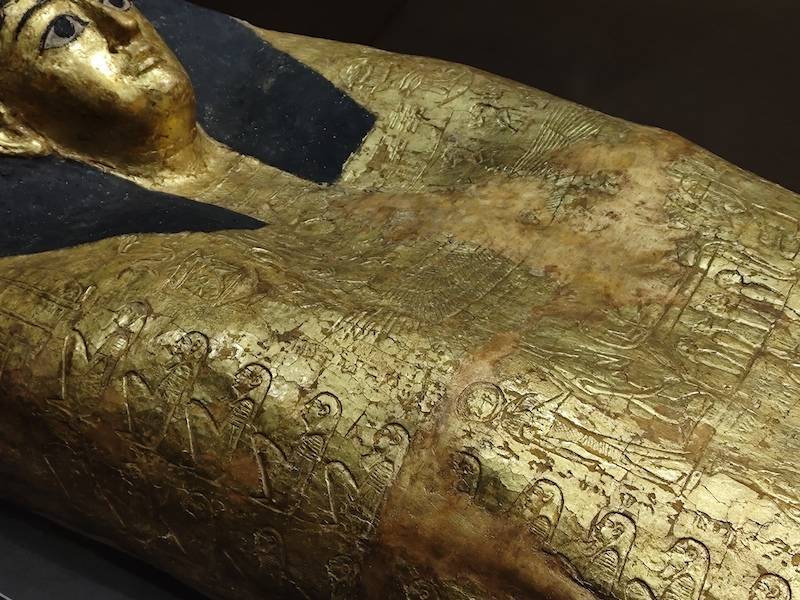 还有一件全身镀金的木乃伊棺椁,它属于一位姓名无从考据的年轻女子,从年代看,她生活在罗马时期。棺椁内的木乃伊有多层绷带,因添加了石膏和水泥,绷带更加坚固,棺椁上的面具使用了耀眼的金箔,引人注目,描绘了理想化的图景,在古埃及墓葬肖像学中的寓意十分丰富。
