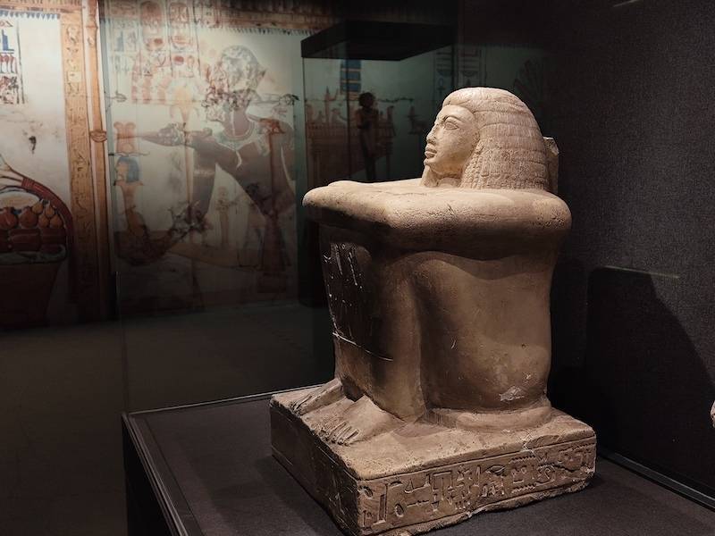 在古埃及时代,如果是祭拜国王、王室和一些有身份的高层人物,祭祀活动通常需要在巨大的封闭空间内进行,如上埃及与下埃及的金字塔式神庙(古王国和中王国时期),或新王国时期的“百万年神庙”。相比而言,私人陵墓中的祭祀面积要小得多,位于墓室核心的小神庙中(古王国时期),或直接在岩石中挖凿出一个空间进行(中王国和新王国时期)。在这里,替代性的雕像、假门石碑、贡品桌、壁画以及所有祭祀仪典中的物品与元素都十分常见,展览中也呈现了这些“替代性的雕像”。