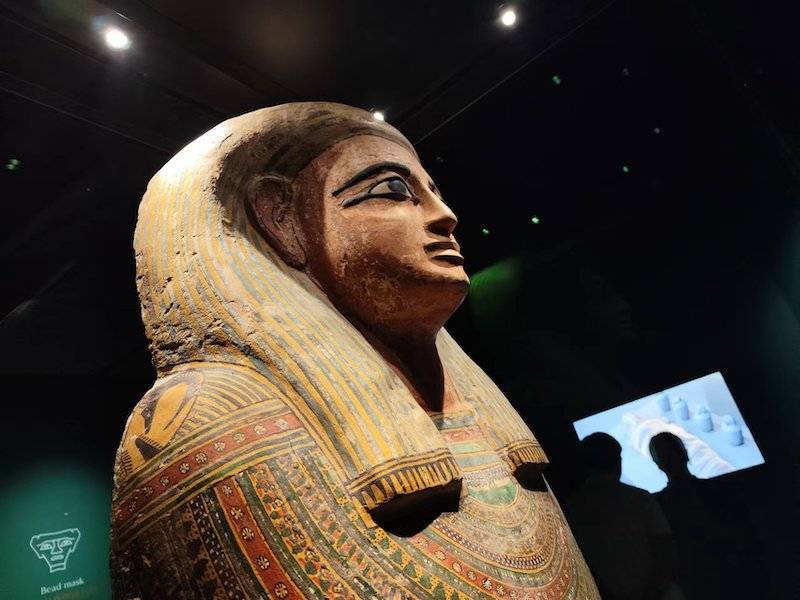 展览中最重要的几件展品包括三件高达一米七的木乃伊棺盖、棺椁。