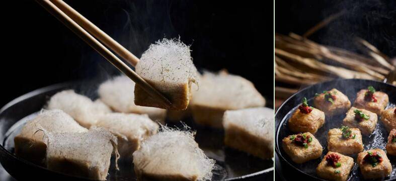 “徽州第一怪,豆腐长毛上等菜”。历经数百年的传承,毛豆腐的香味依然飘散在徽州的大街小巷,成为一种独特的文化符号。泡豆、烧浆、点腐……几十道复杂而严谨的工序后,以油煎至两面金黄,再刷上辣椒酱,撒上葱花、洋葱,小小方块里,方能孕育出咸鲜微辣、外脆里嫩的美味。