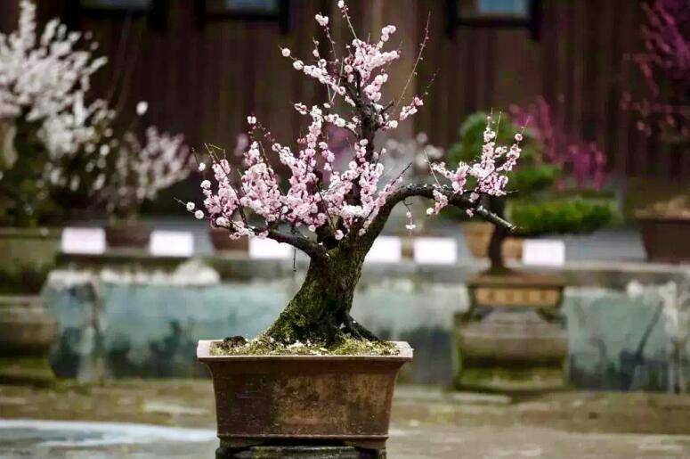 这个时节,梅花盆景开得颇多。而最能代表徽派盆景艺术特色的是徽梅,又名龙桩:梅树枝干从基部到顶部蟠曲呈“S”形,似游龙破土而出,蜿蜒直上,显得粗犷又神秘,枝头的花苞还未完全开放,零零星星挂在枝头,轻灵飘逸。