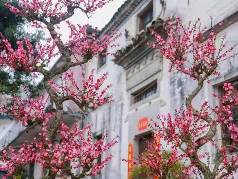 沿着古朴幽静的村中小道,信步而行,梅韵无需寻访,骨里红、二红、玉蝶、绿萼......种种没听过的、叫不出名字的梅花品种,都在眼前争相盛放,绽放出一片徽州最浪漫的色彩,为整个村庄添了一分柔情。