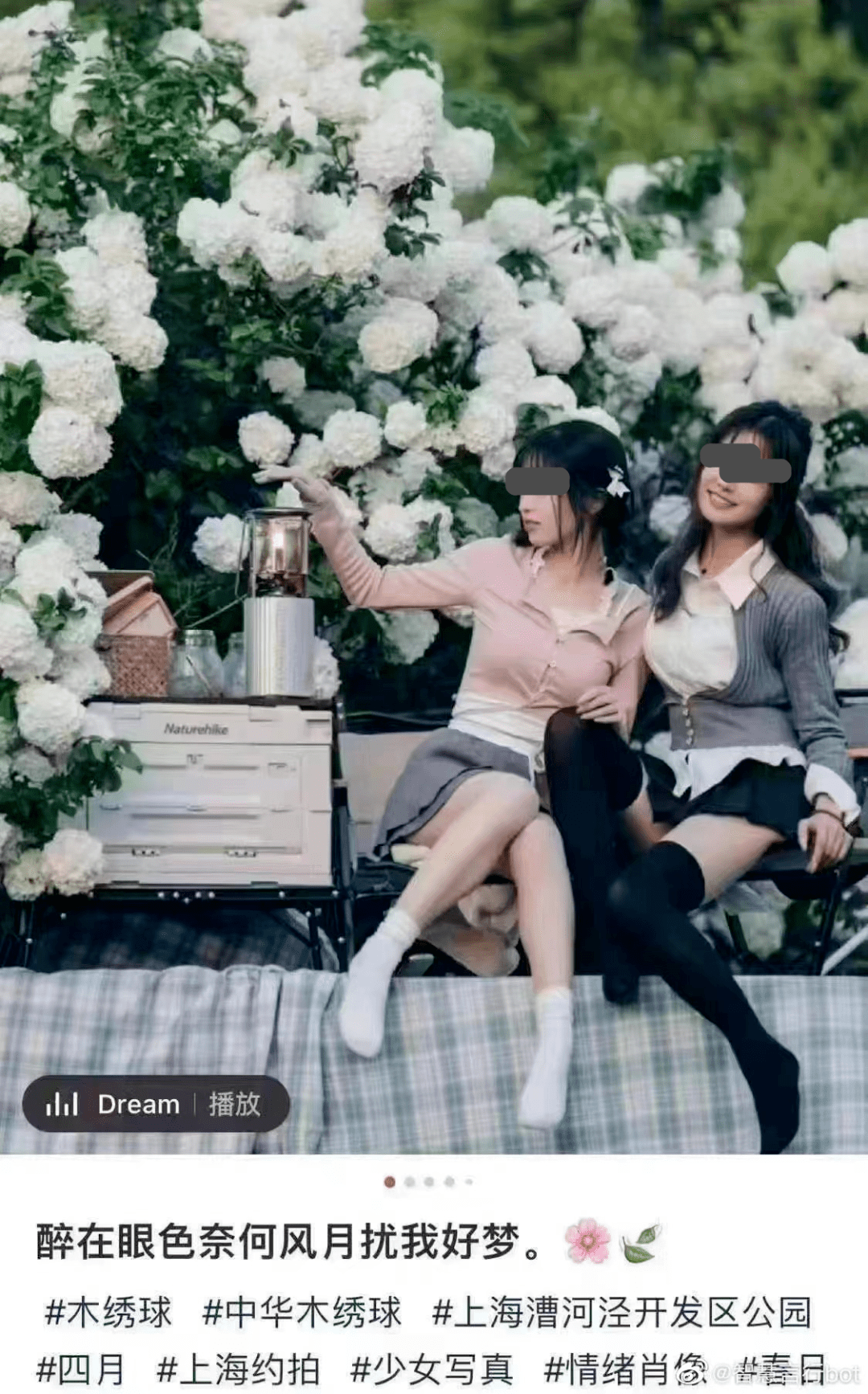 看是是妥妥的小绿书精致生活的打卡典范吧:两个女孩,白瘦幼,青蓝滤镜,树下打卡,微风不燥,生活美好是吧。
