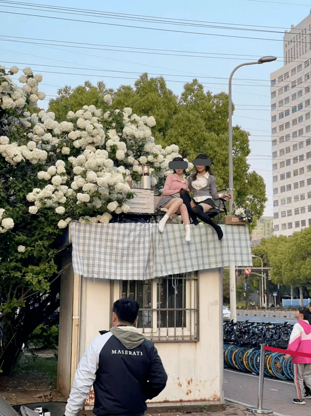 然而事实是,这两个女人坐在某个地铁口的保安亭上,拍照完成后修改出来的照骗,而且还自带拍摄道具和打光,一看就是网红在噶韭C。