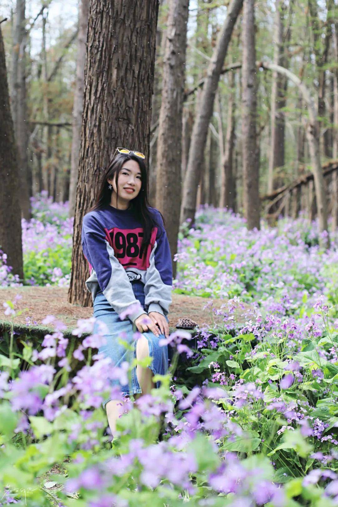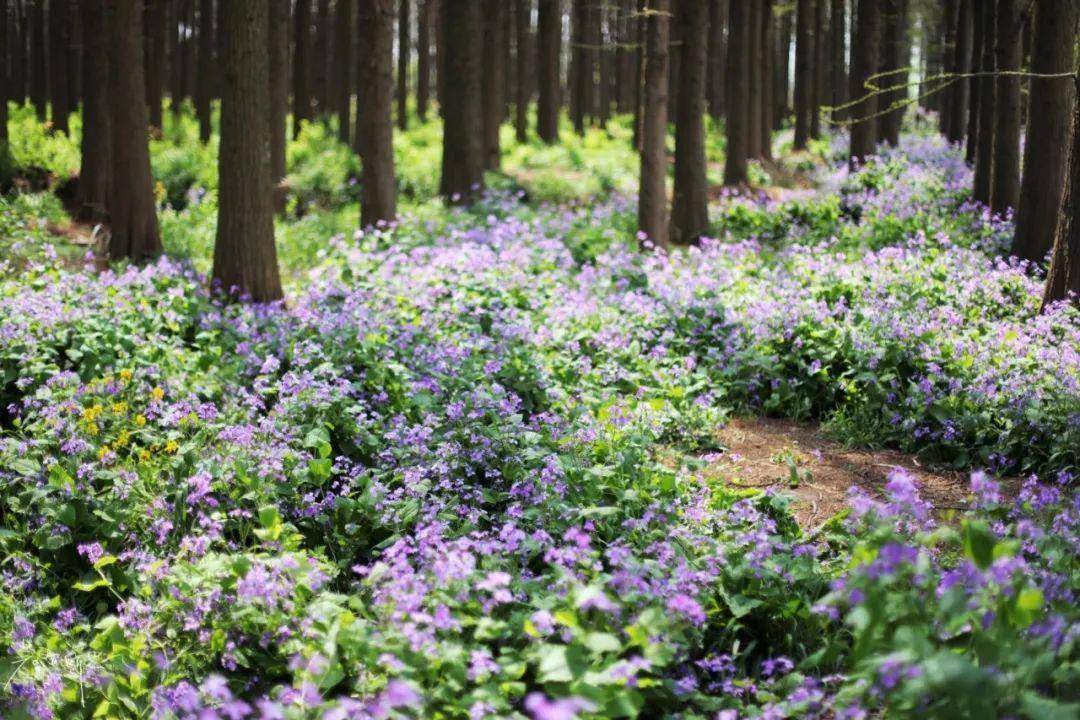 真的是二月兰的花海啊!关键树林里不晒,鸟语花香,真的太舒服了。坐上水上竹筏,晃晃悠悠,水面倒映着树林和二月兰,梦境似的场景。