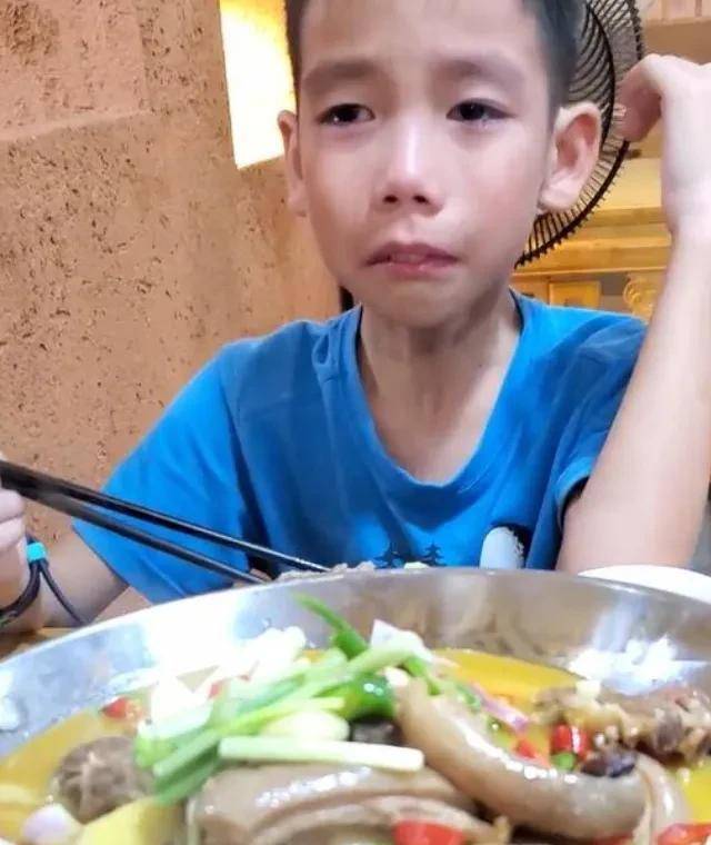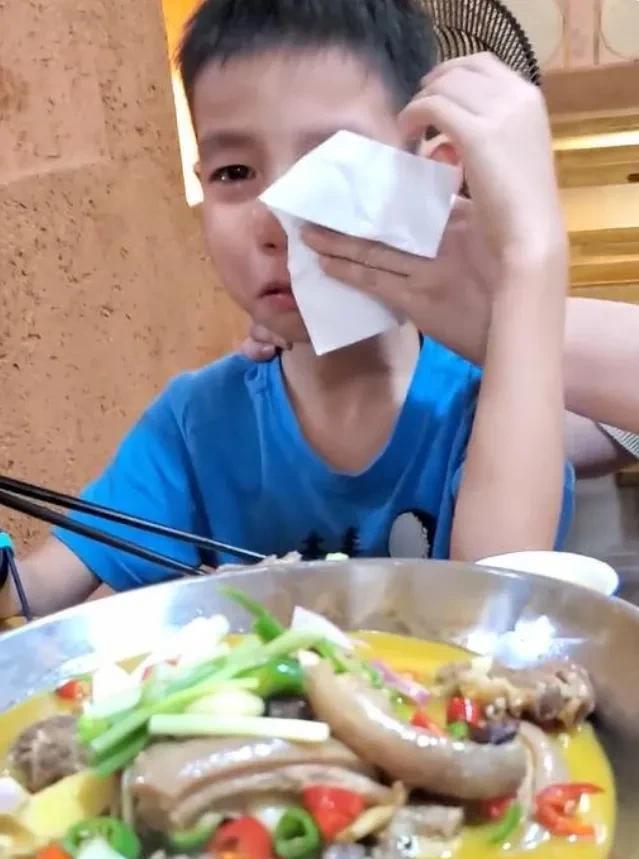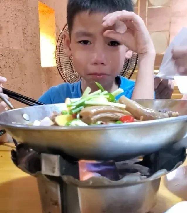 小男孩忍不住夹菜来吃,顿时泪流满面。