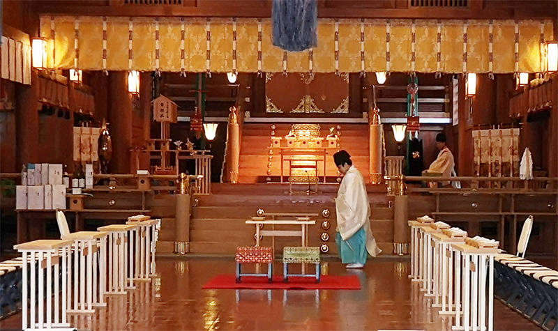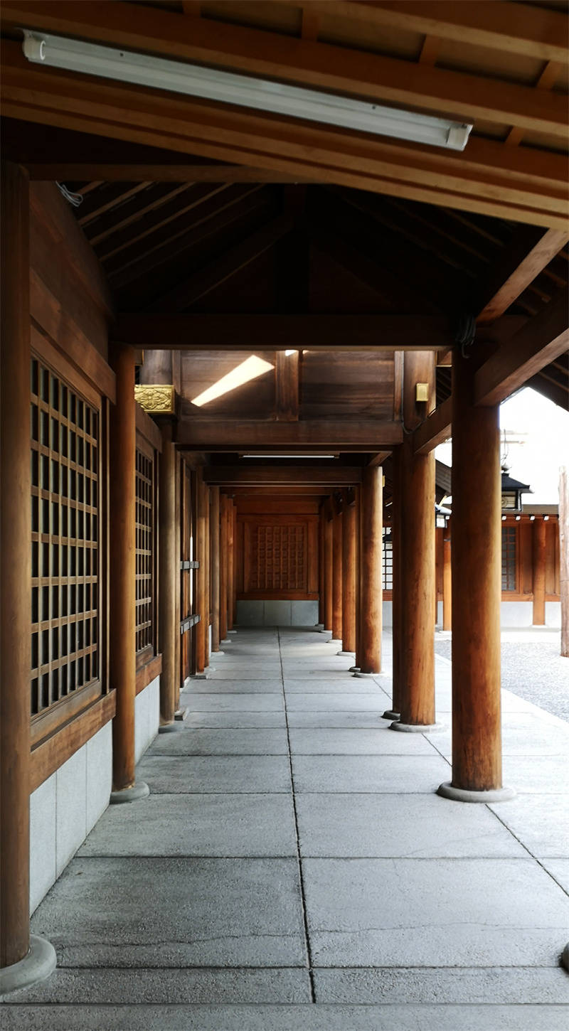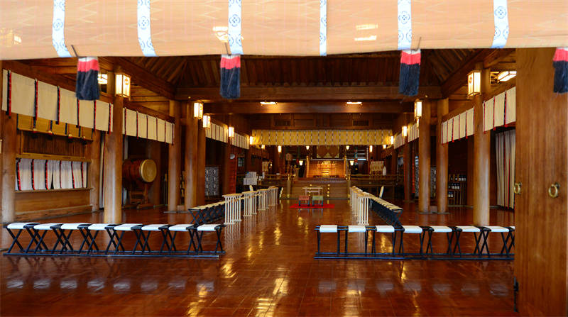 顿宫大殿是北海道神宫的主建筑,两根粗木交叉搭建成的屋顶坡度很大,应当是考虑到北海道冬季大雪的因素。殿内陈设简约且世俗,浓郁的日式风情。有意思的是不见神像与牌位,也不设香火,不知是传统的规矩,还是进入现代的演变,这和中国佛教寺庙有很大的区别。
