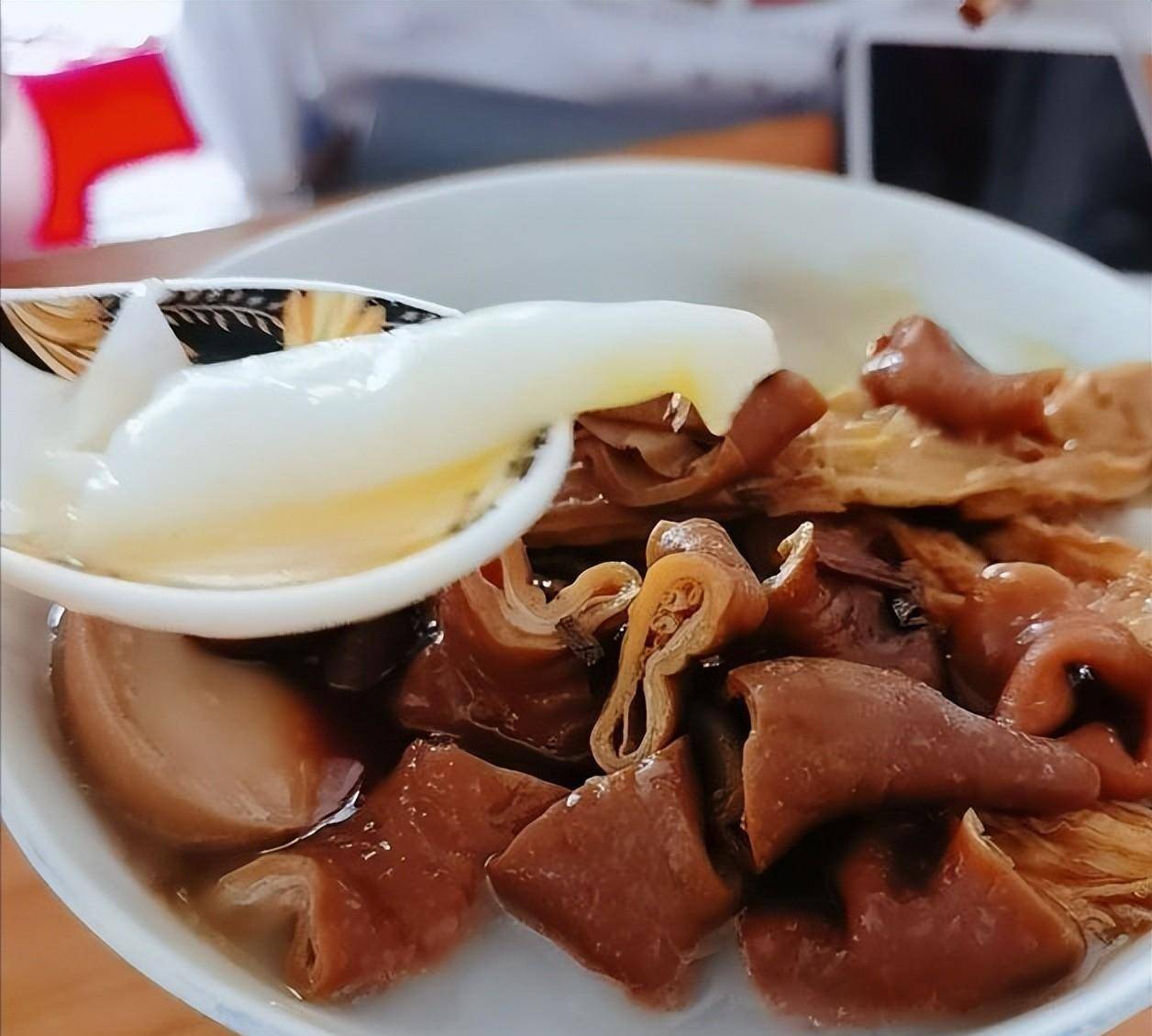 这个粿汁的价格不定,丰俭由人,普通的10元15元都能吃,喜欢吃卤水的20元30元也可以点,也可以单点卤水拼盘,除了猪大肠还有卤蛋腐皮等等,都是卤香味十足。方庆云要了一个20元的粿汁,端上来面上是香菜,可以提香增味,下面是卤大肠,大肠处理得很干净没有异味,而且卤味很重,但是吃起来又很清爽,卤得很入味。老板会把卤好的料堆在旁边,客人要吃啥再放入卤锅加热,这样更入味了。热腾腾的卤汁香弥漫了整间屋子,让那个人口水直流。