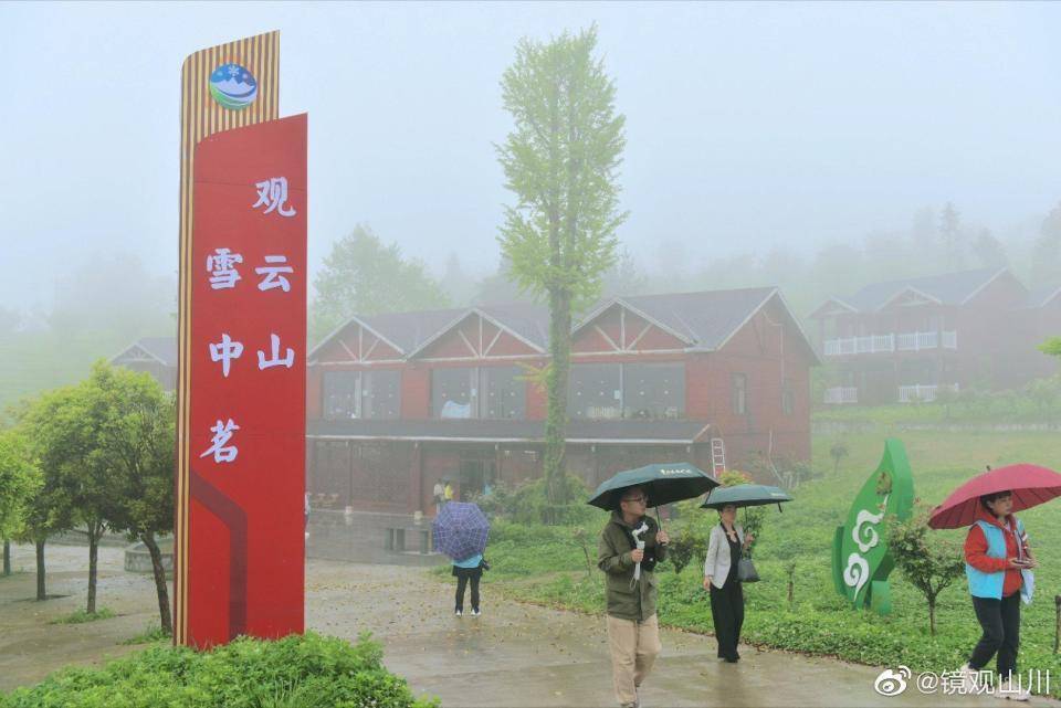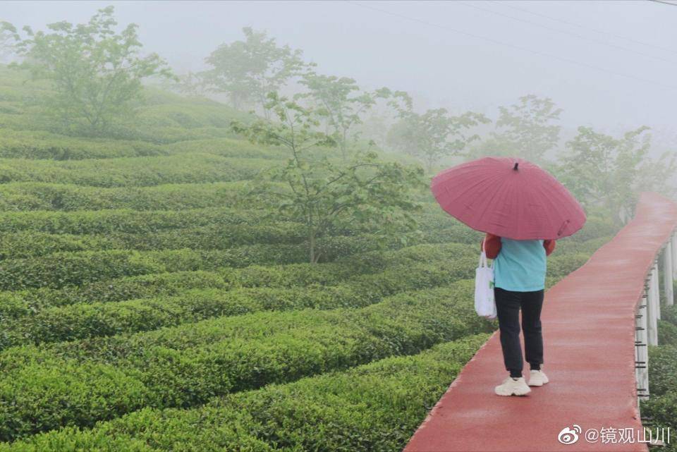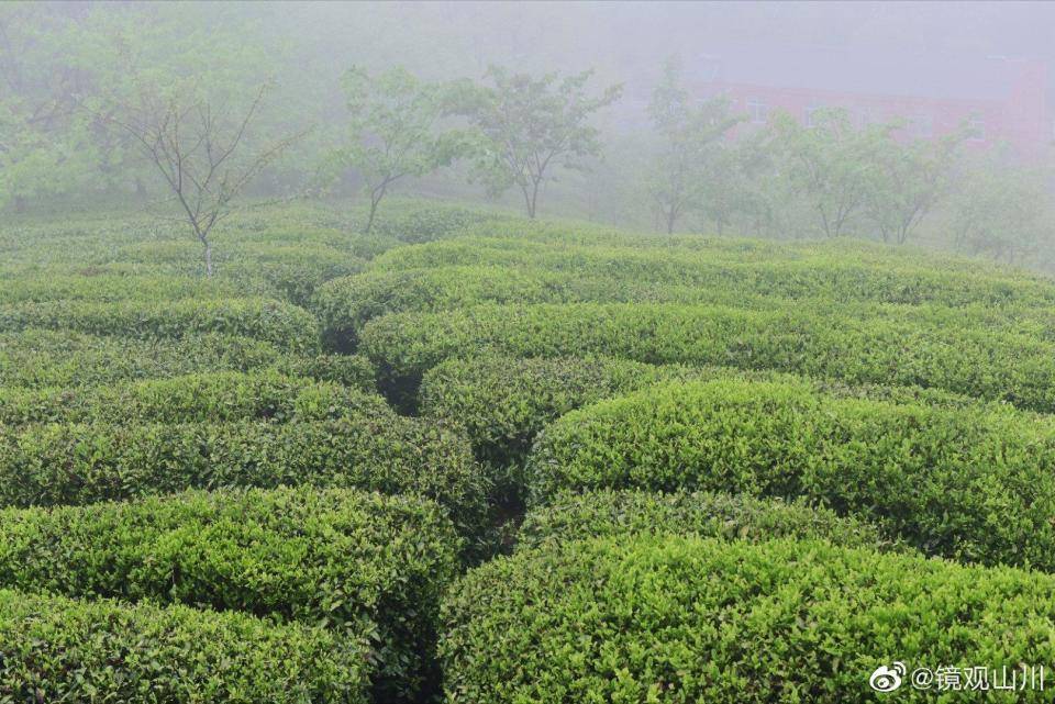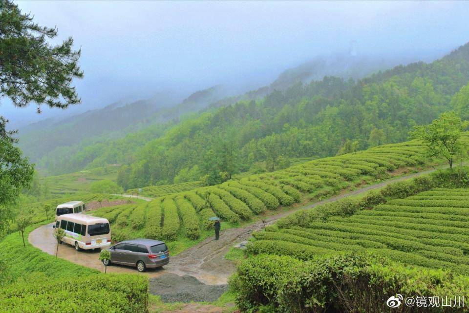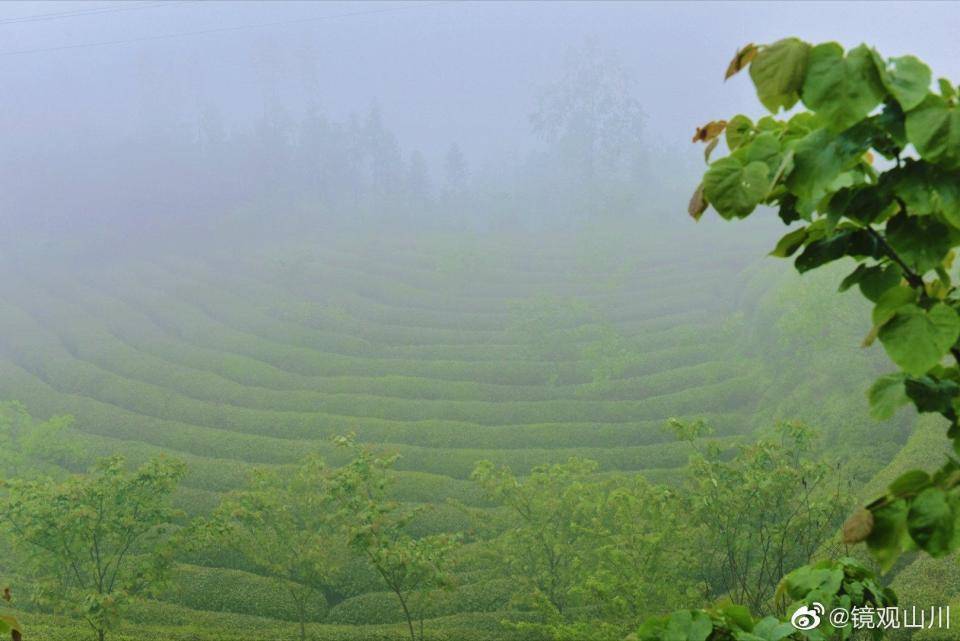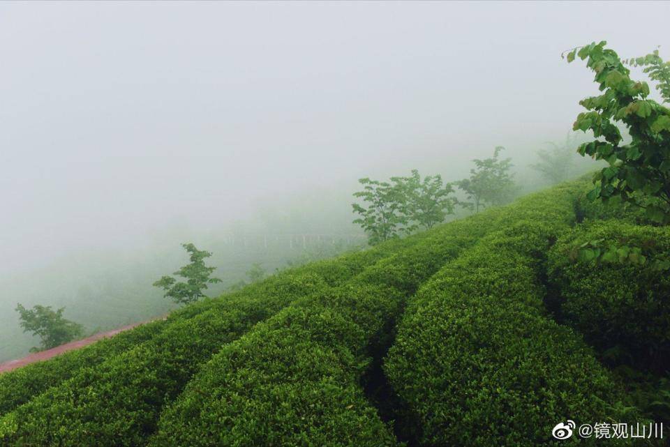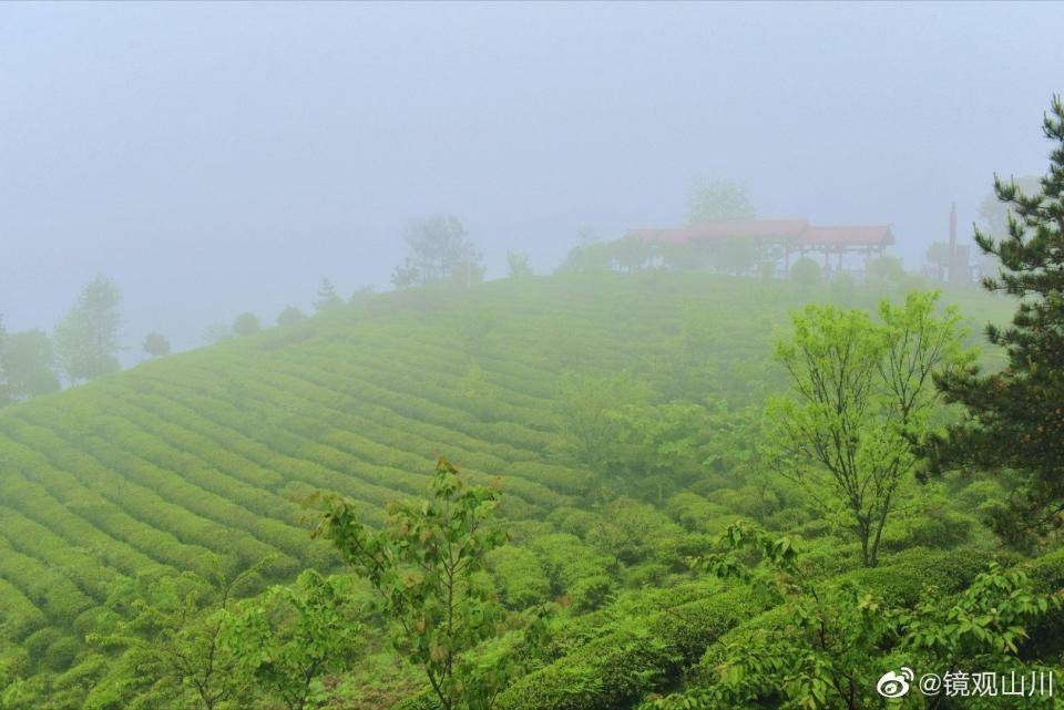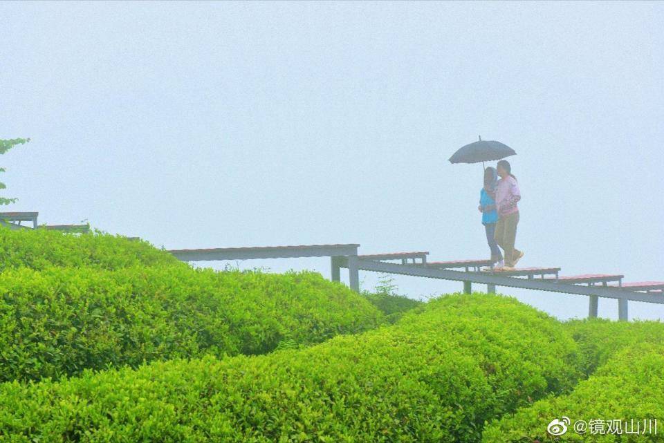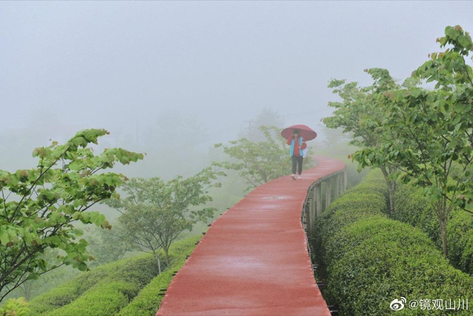 茶园地处海拔1200米高山,终年云雾缭绕。雾中漫游在层层叠叠的茶园栈道上,雨雾蒙蒙、湿漉漉的栈道两边,翠绿茶树上的嫩芽挂着晶莹的水珠,生机盎然的挺立在温润的雾气里。