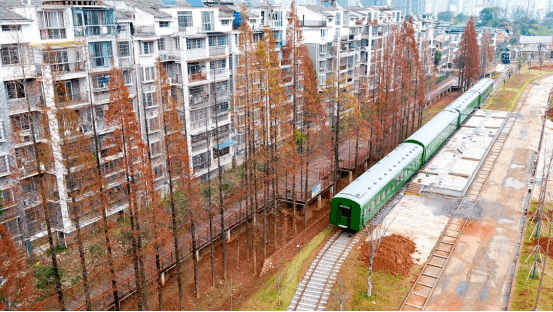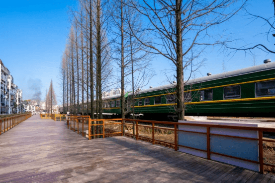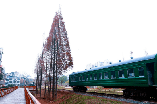除了铁路元素和景观小品外,在公园内还有三节绿皮火车车厢很是吸引眼球。