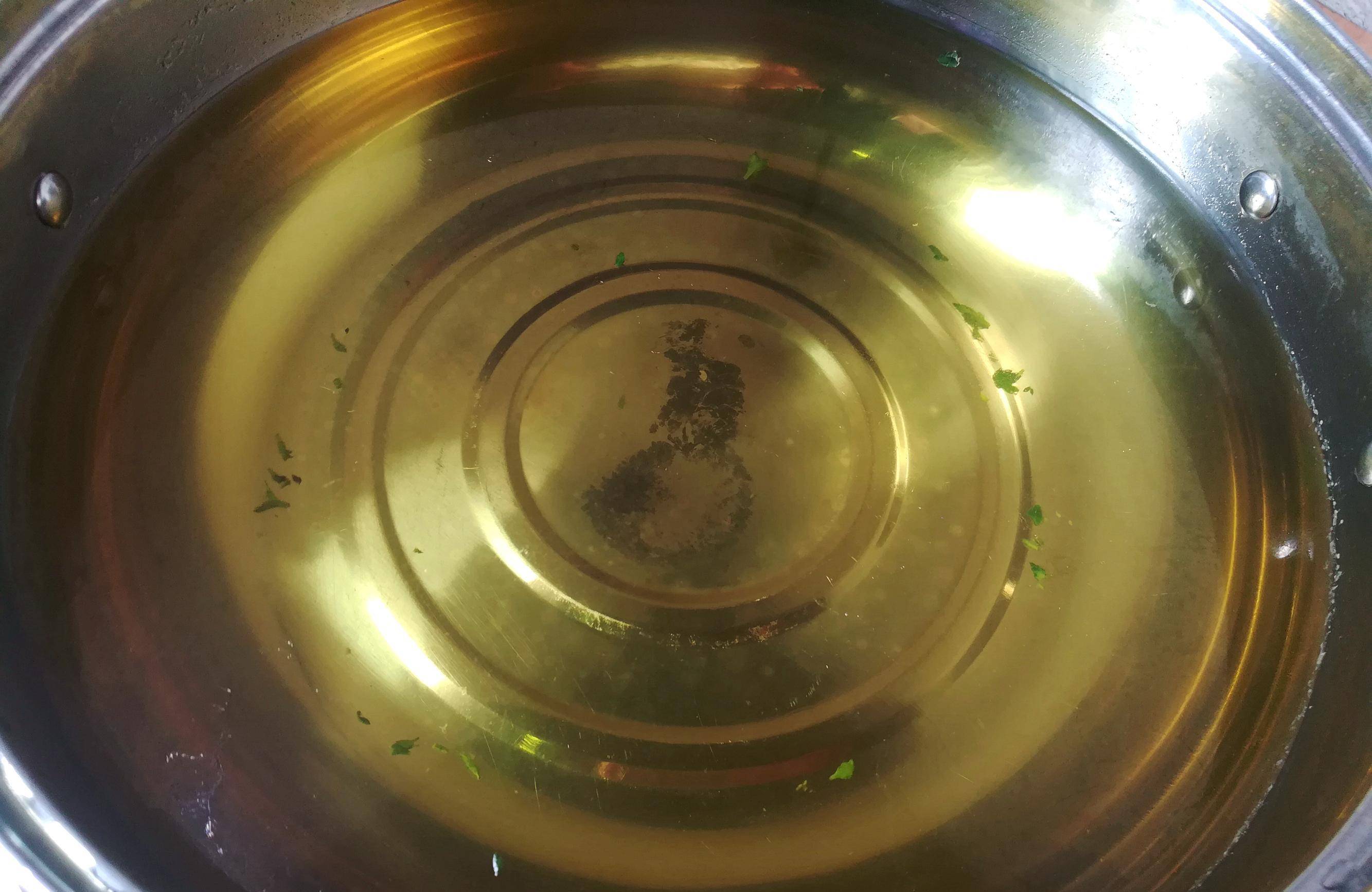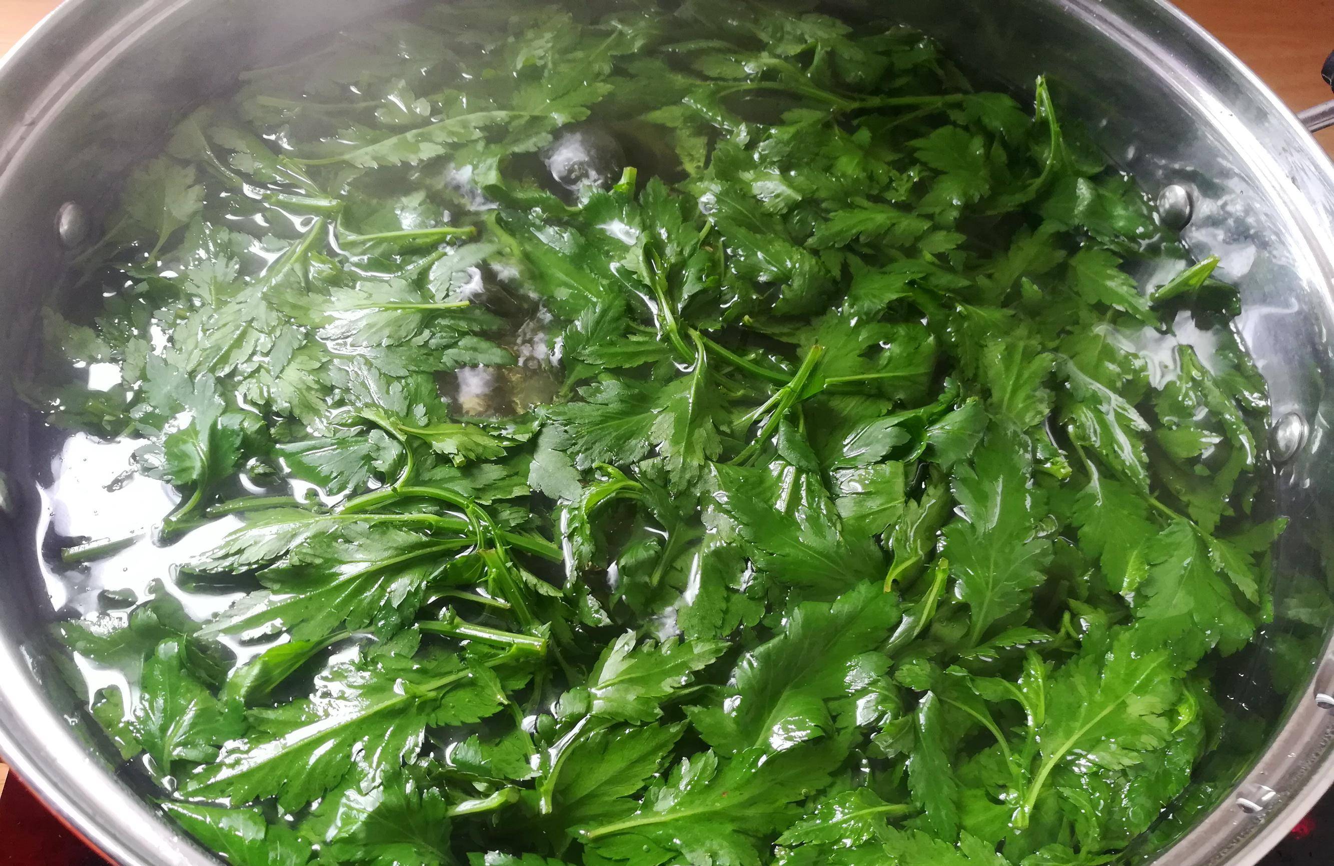 烧一锅热开水,放几滴油和一点点盐,保持大火加热,把菊花脑放一部分进开水里,用筷子快速翻拌一下,变色断生后马上捞出来。蔬菜焯水的时候,加食用油和盐,可以让其保持颜色翠绿不发黄。