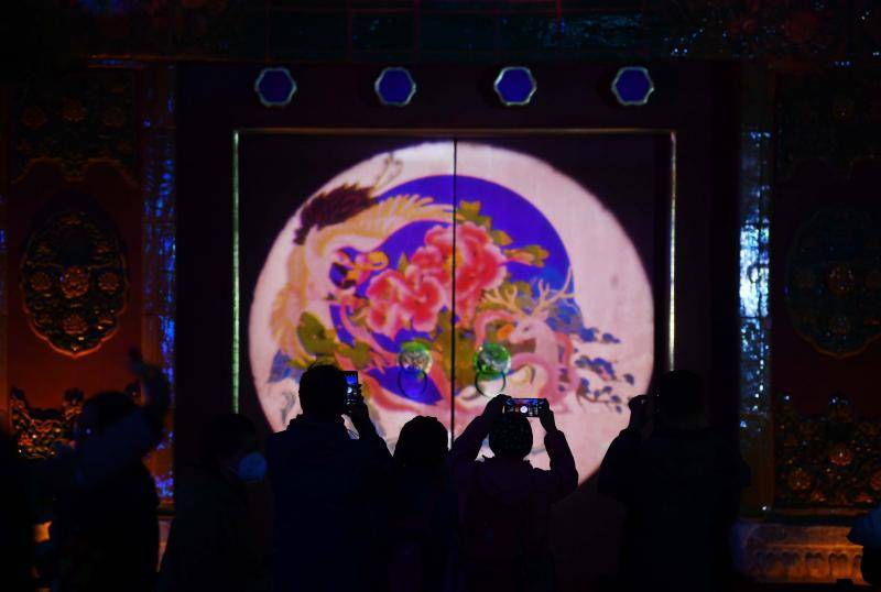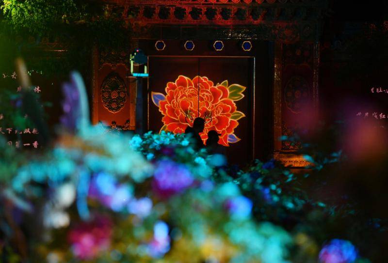 同时,景山公园在古建院落观德殿南门及两侧围墙,设置了图案灯,在红墙光影中,为游客呈现牡丹绽放盛景。游客徜徉于中轴古建地标之中,不仅能欣赏到夜幕下国色天香的朦胧美,还能在古建光影中品读牡丹诗词歌赋,沉浸式感受牡丹与中轴古建相得益彰的文化韵味。