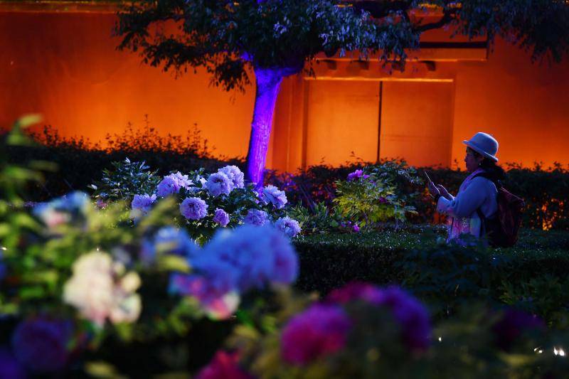 4月21日晚19时,北京青年报记者在景山公园牡丹园看到,随着夜赏灯光亮起,不少游客在园内驻足欣赏盛开的牡丹。据了解,景山公园在东门内牡丹品种园、后山主路设置478组照明灯,光影变幻的灯光可覆盖百余种珍稀牡丹。