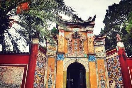 景区看点;白帝庙大门如今的白帝城,广义上即指白帝庙,内有明良殿、武侯祠、观星亭等明清建筑。明良殿为嘉靖十二年(1533年)建,系庙内主要建筑,内有刘备、诸葛亮、关羽、张飞塑像。武侯祠内供诸葛亮祖孙三代像。祠前的观星亭,传说是诸葛亮夜观星象的地方。明良殿和武侯祠左右两侧藏有各代名碑。庙内还有文物陈列室、诗史堂,陈列着新石器时代以来的出土文物和古今名家的书画。这些古建筑和文物珍品,使白帝城更为增色。