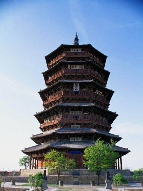 应县木塔,也成为释迦塔,位于山西省朔州市应县城西北佛宫寺内,建于辽清宁二年,金明昌六年增修完毕,是中国现存最高最古的一座木构塔式建筑,全国重点文物保护单位,国家AAAA级景区。