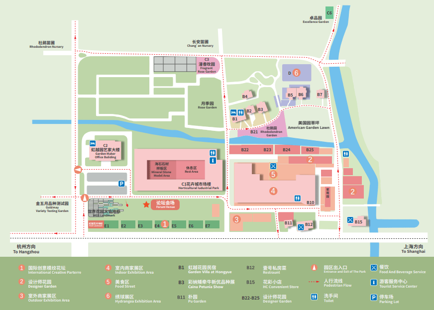 花展主要为设计师花园、户外商家花园、室内商家花园、模纹花坛、绣球展、品种园和高标准苗圃、汽车露营等。