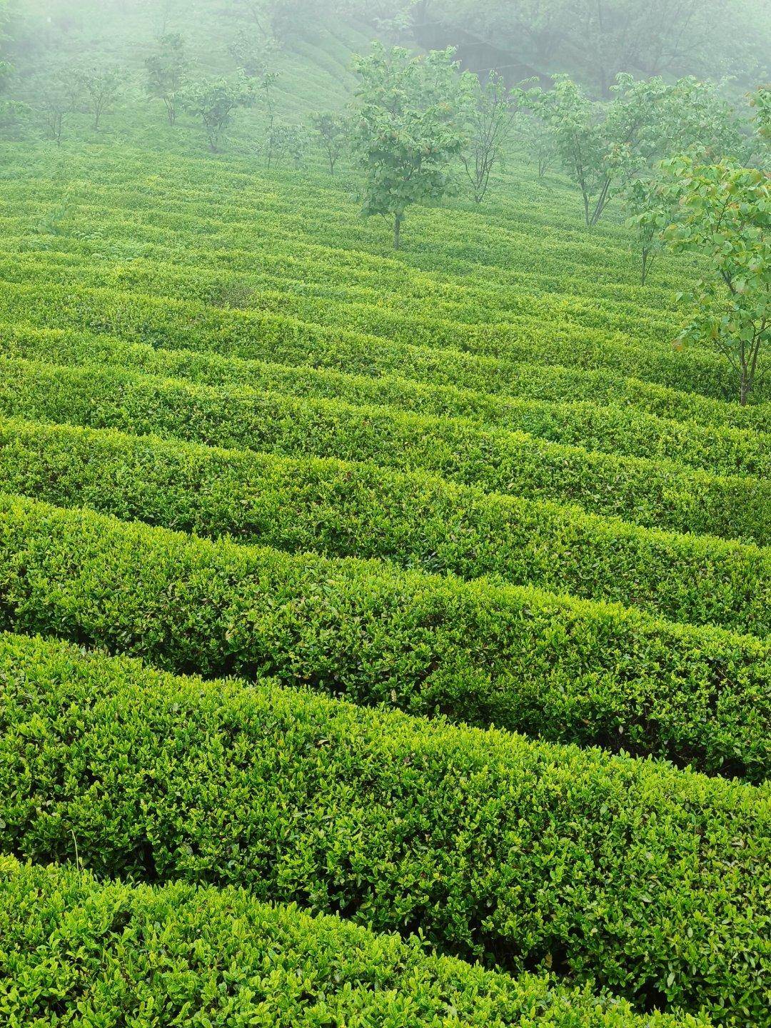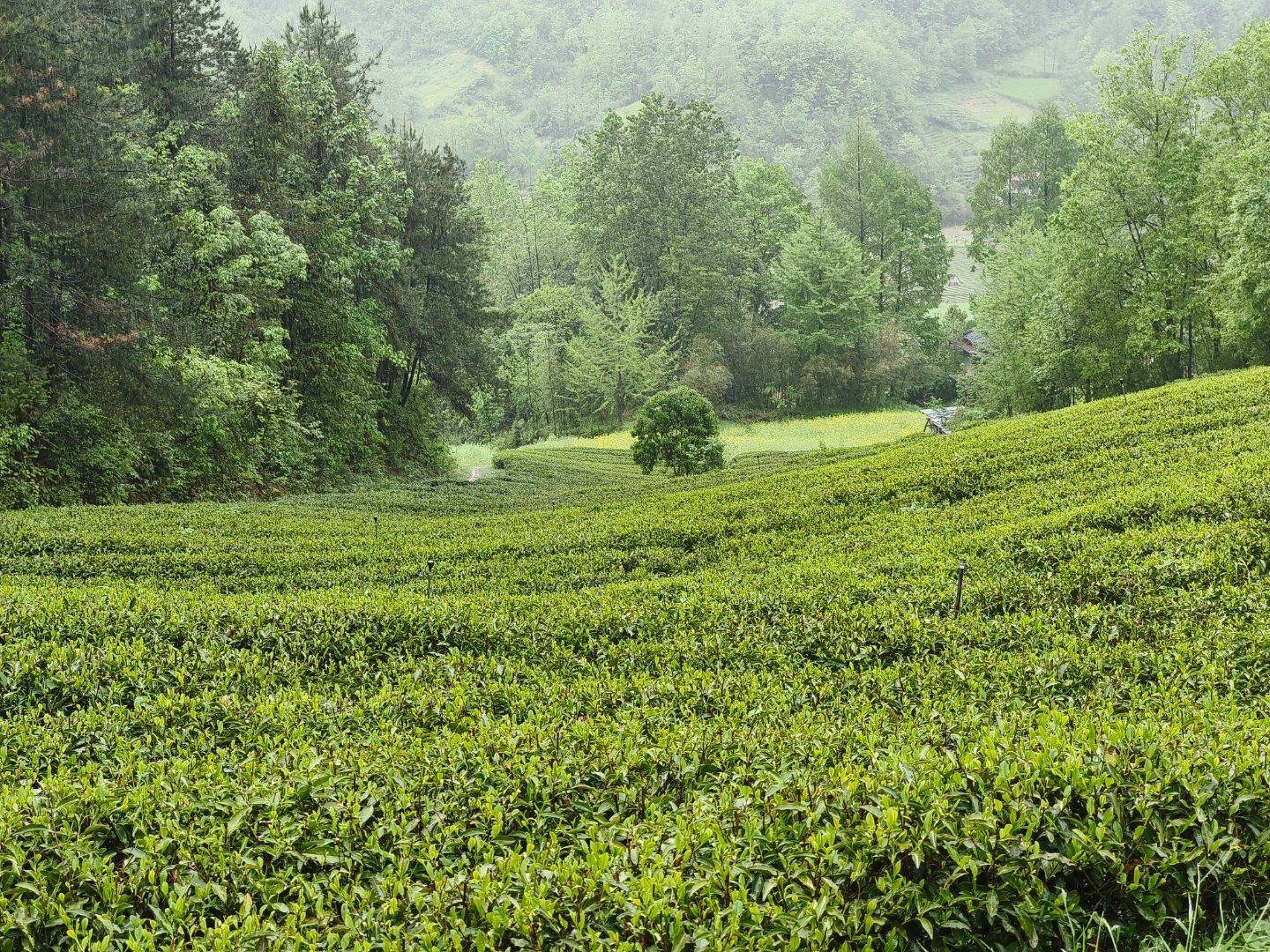 细雨蒙蒙,有云自山脚下慢慢升腾而起,拉出细细长长的云雾,缭绕半山腰。雨中的茶树,泛着翠翠、润润的新绿,舒展柔柔、嫩嫩的枝叶。空气清新宜人,茶笼上的蛛网整洁雪白,网上密密坠挂晶莹小露珠,网住了一晨雾气,也网住了一园茶色。