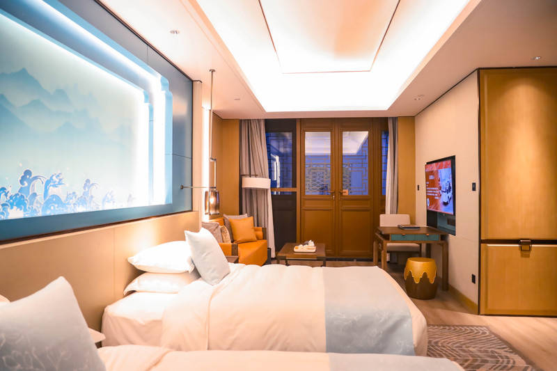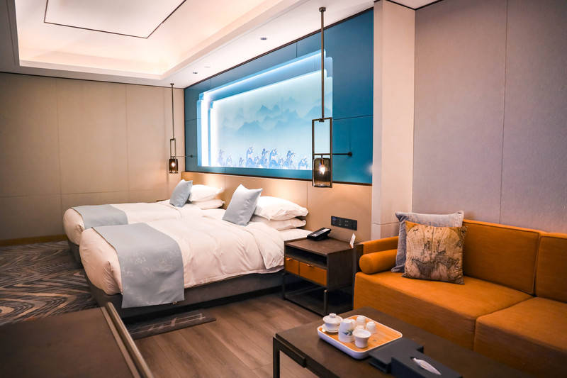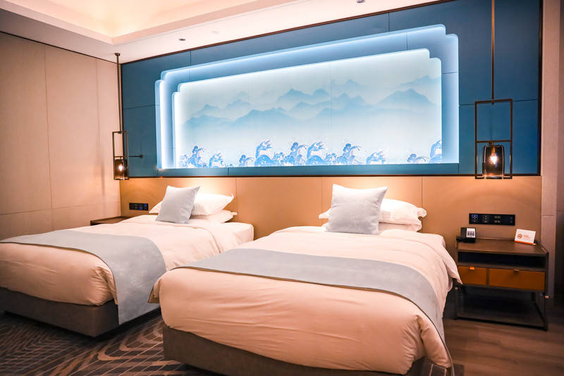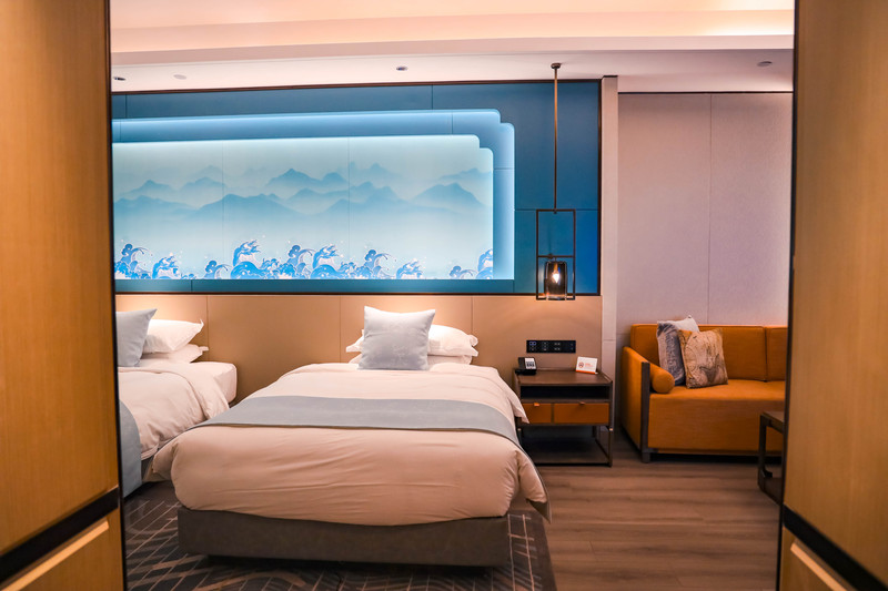 晚上下榻于海丝行馆,海丝行馆的客房非常有艺术气息,床头的壁画是山与海的结合,淡淡的蓝色,像是一件艺术品,点亮了整个房间。
